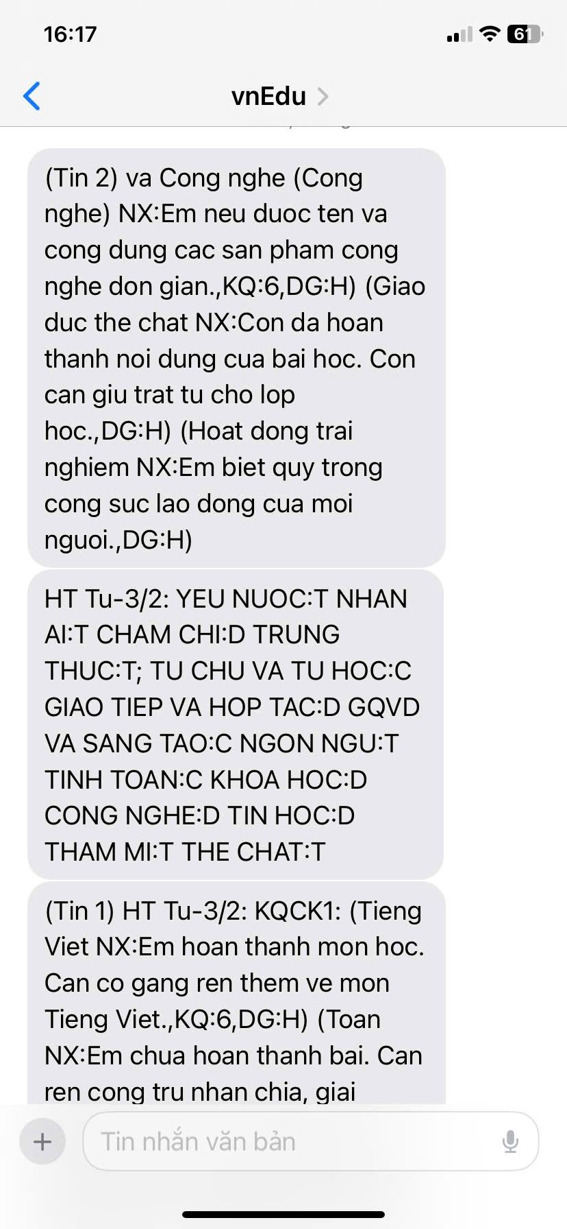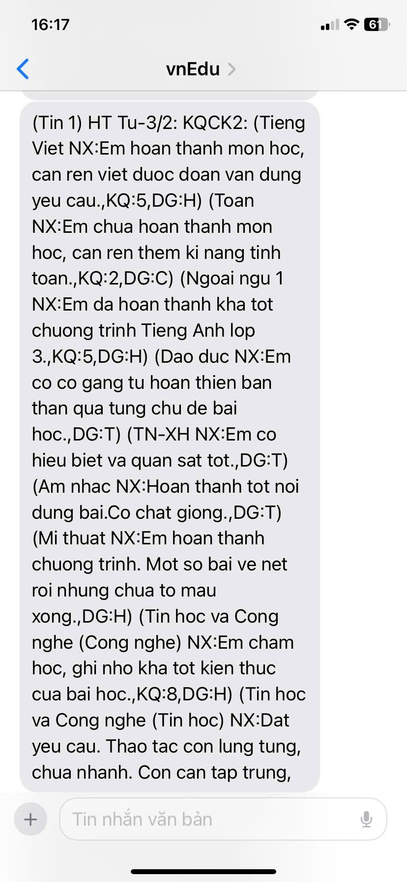 Gửi cả nhà kết quả học tập gửi qua tin nhắn phụ huynh.