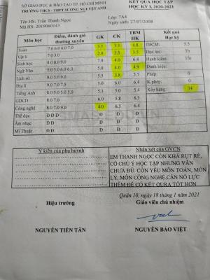 Em Ngọc hiện đang học lớp 8, trường THCS Sương Nguyệt Anh, do đang ở tuổi mới lớn, tâm sinh lý thay đổi rất nhiều, làm ảnh hưởng không nhỏ đến việc học nên thành tích học tập của em không được tốt lắm. Học kỳ này, em được miễn đóng học phí theo diện hỗ trợ của nhà nước.