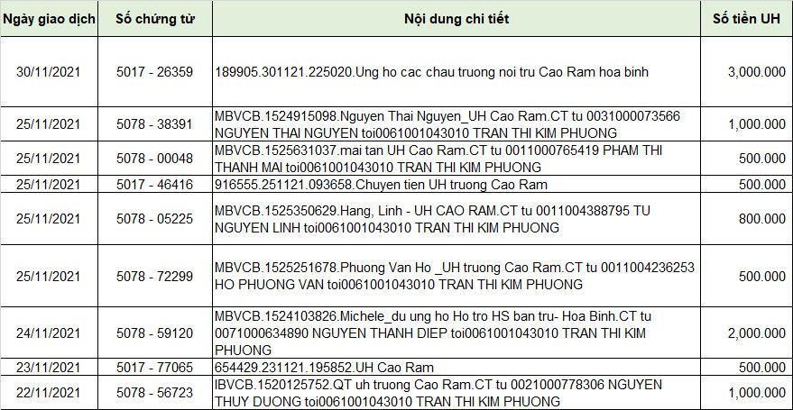 Tính đến ngày 01/12/2021 số tiền nhận được ủng hộ cho các con bán trú Trường Cao Răm là 18.100.000 đ trong đó mai tan giữ tiền mặt là 1.000.000 đ