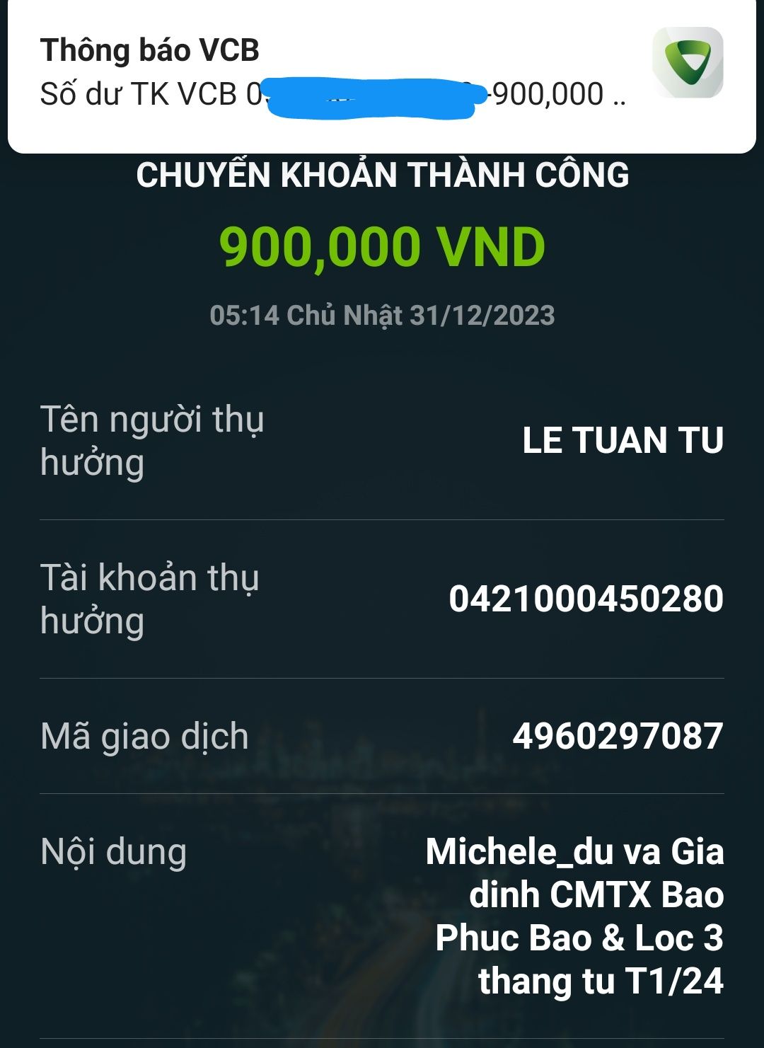 Michele_du và Gia đình tiếp tục CMTX 2 cháu Bảo Phúc & Bảo Lộc 600,000₫/tháng từ tháng 12/2022 đến hết tháng 11/2023 các bạn nhé.