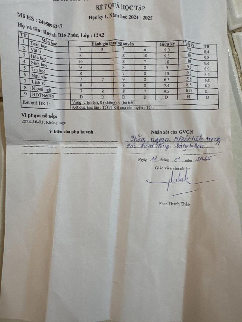 Cảm ơn Bảo Phúc đã chia sẻ kết quả học tập cho mọi người cùng biết, chúc mừng em có thành tích tốt nhe!