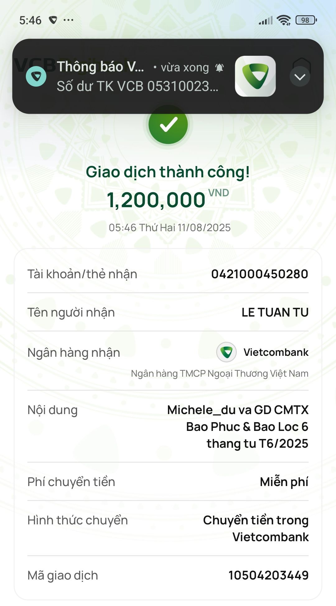 Con đã nhận được 500k tiền tháng 6 từ anh letuantu rồi ạ 😍😍