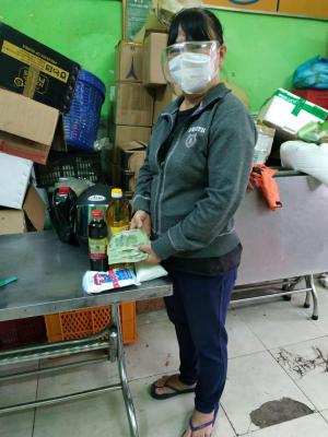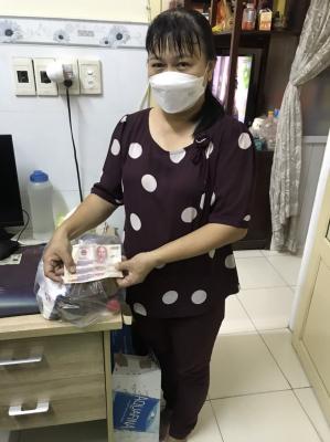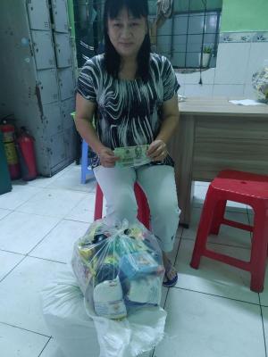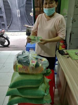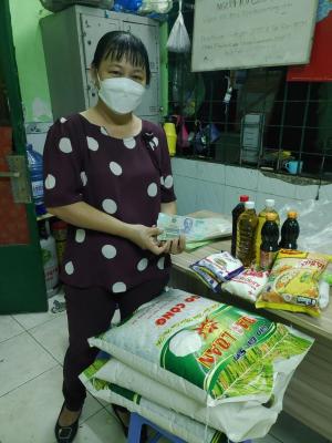 Hôm nay, chị Nga - mẹ em Minh đã đến quán cơm để nhận gạo, nhu yếu phẩm và 300,000đ tiền CMTX T12 do chị Thaohang hỗ trợ.