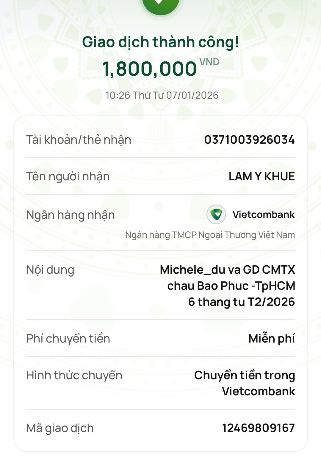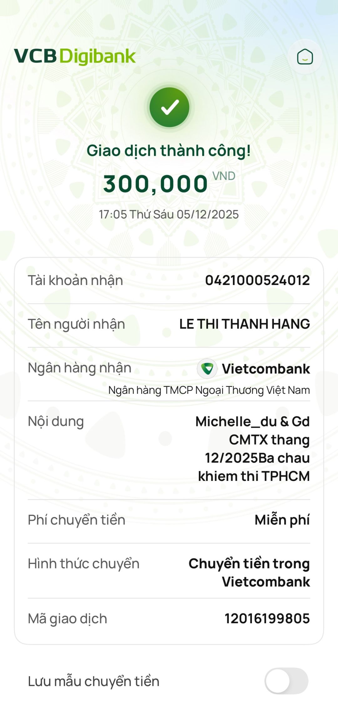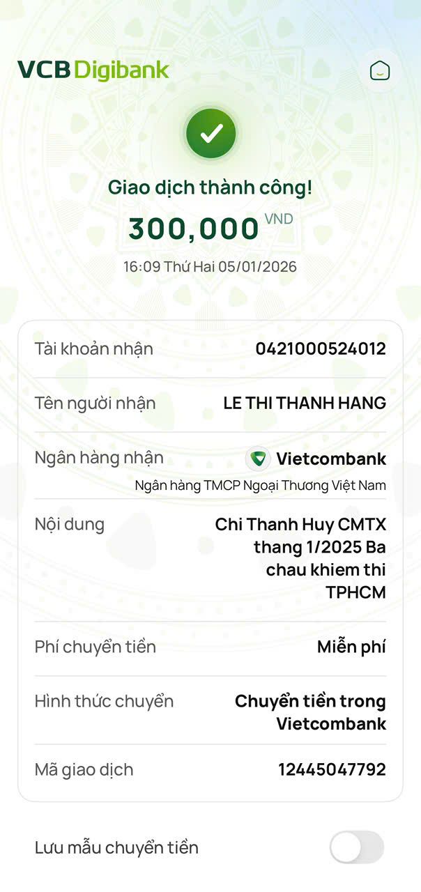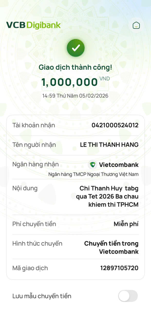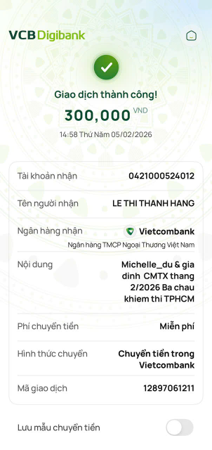 Tháng 2/2026, Tieuhuongduong đã trung chuyển 300,000đ CMTX của Michelle_du và gia đình, 300,000đ của chị Thanh Huy.