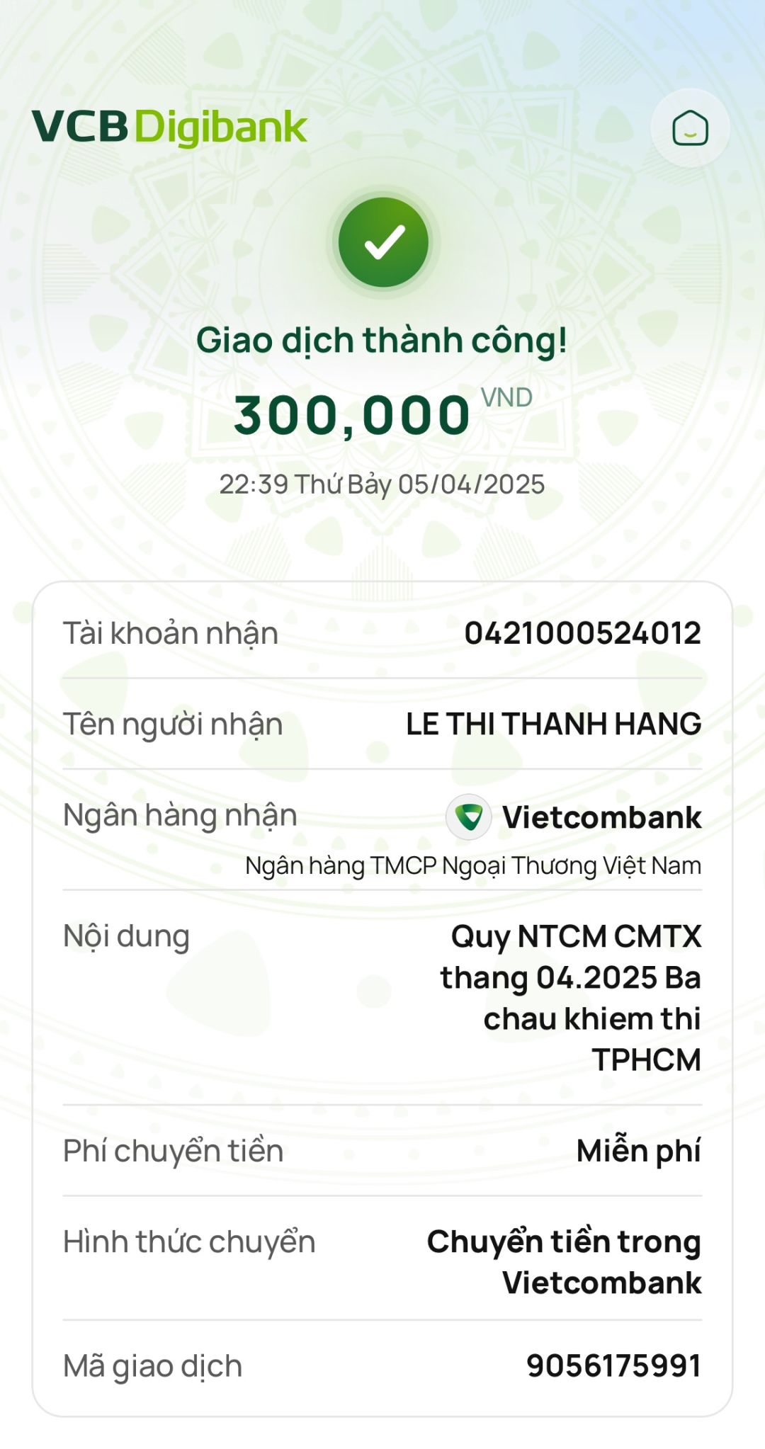 Tieuhuongduong đã chuyển khoản đến mẹ các cháu CMTX tháng 4/2025 từ Quỹ NTCM 300 000đ và của chị Thanh Huy 300 000đ