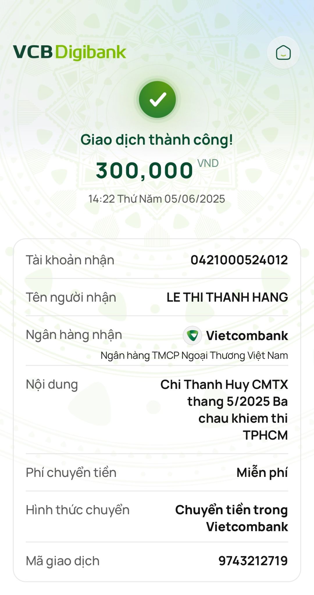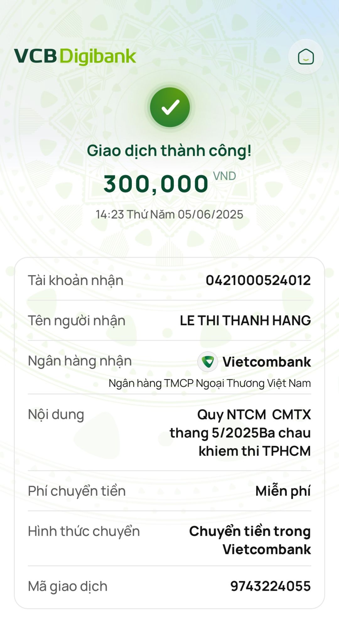 Tieuhuongduong đã chuyển 300.000đ của chị Thanh Huy CMTX các cháu tháng 5/2025.