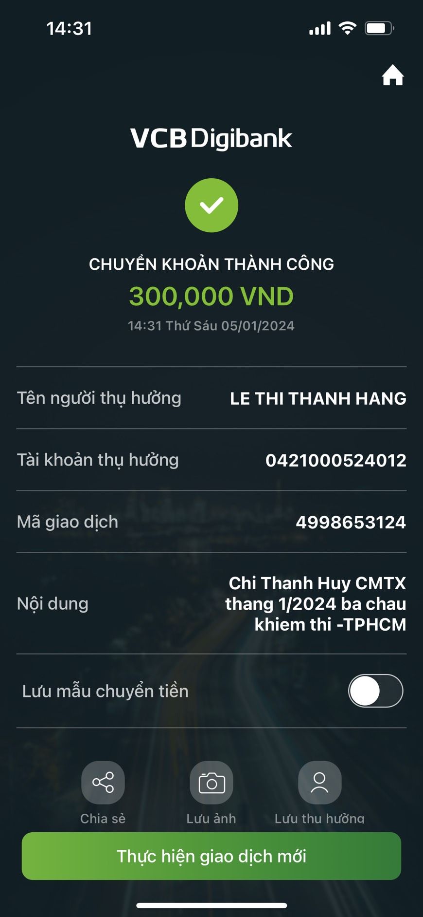 Thân gởi cả nhà hình ảnh chuyển khoản 300,000đ CMTX tháng 3/2024 đến các cháu.