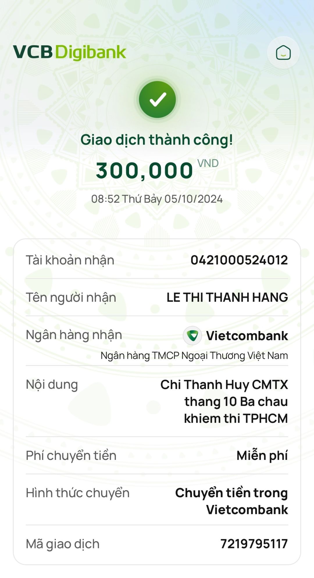 Chị Thanh Huy đã chuyển khoản 300,000đ CMTX tháng 10 đến các cháu.