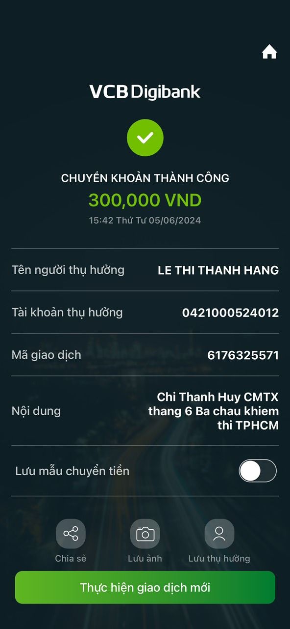Chị Thanh Huy đã chuyển khoản 300,000đ CMTX tháng 6 đến các cháu.