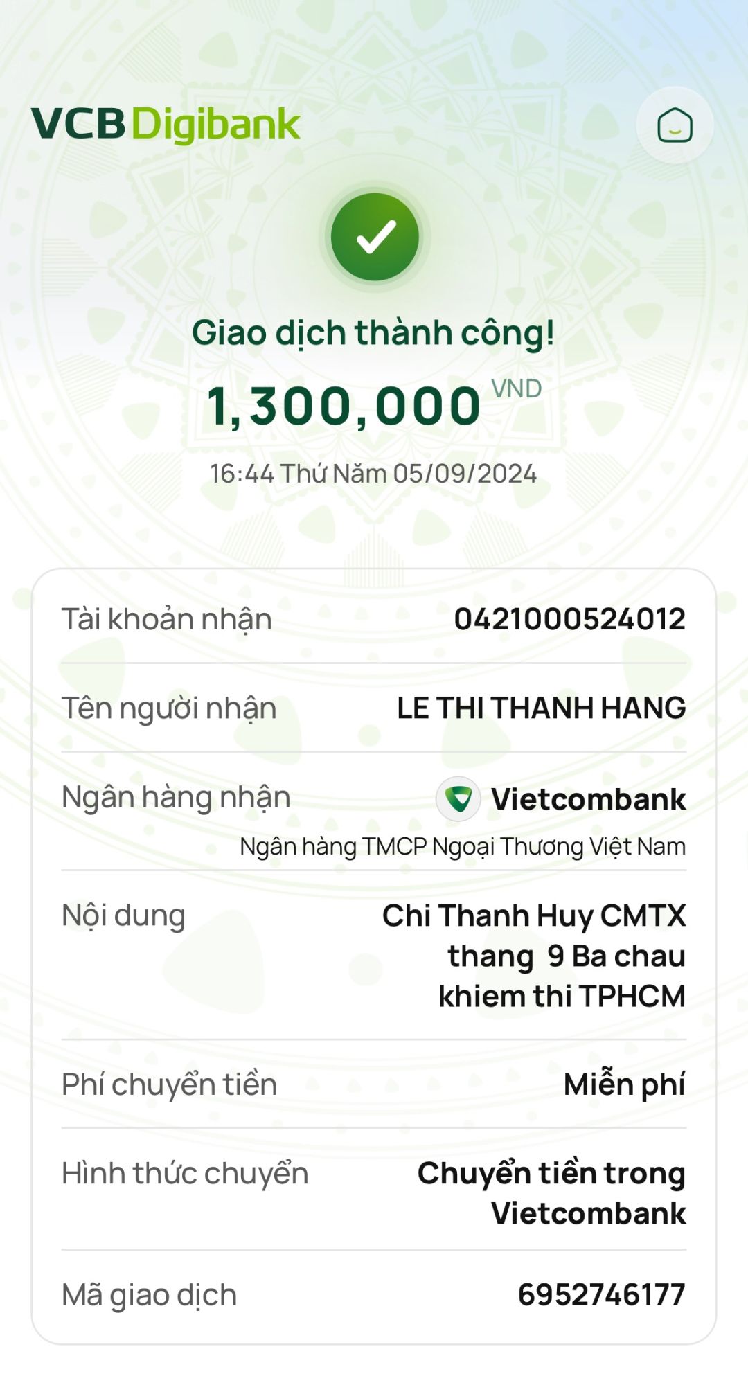 Chị Thanh Huy đã chuyển khoản 300,000đ CMTX tháng 10 đến các cháu.
