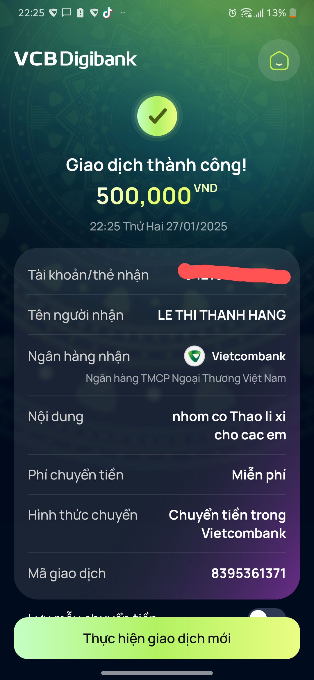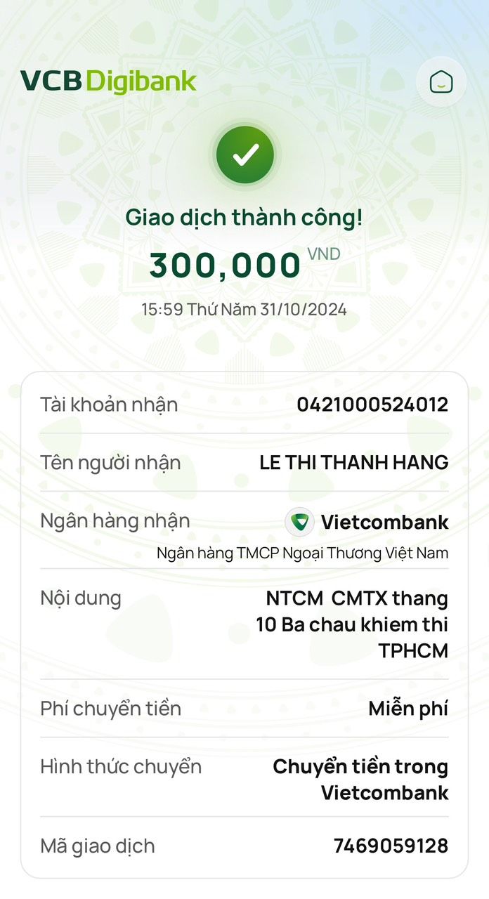 Tieuhuongduong đã nhận đủ 900,000đ CMTX 3 tháng và đã chuyển 300,000đ tháng 1/2025.