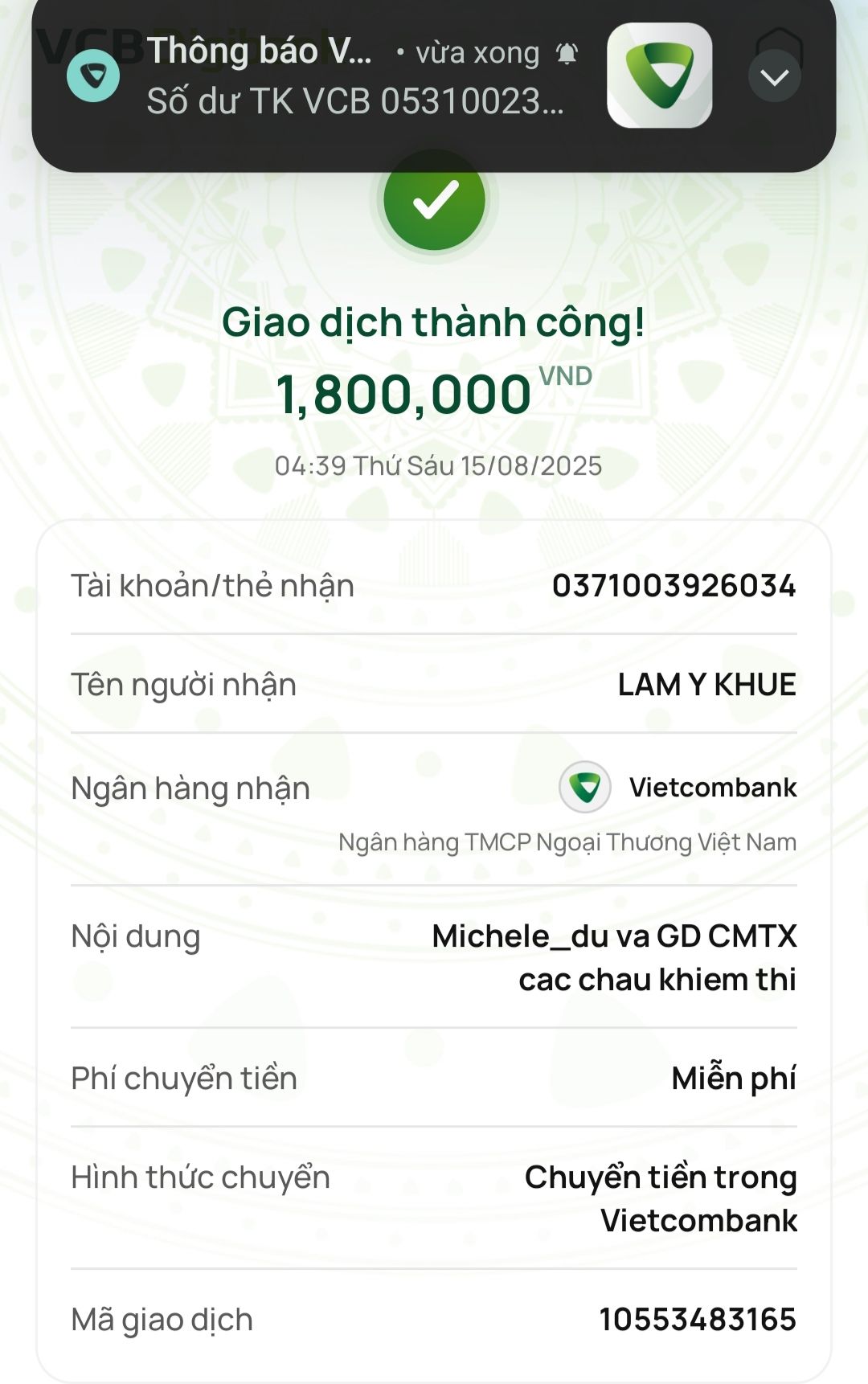 Tieuhuongduong nhận đủ 1.800.000đ. Cảm ơn Michele_du & gia đình ạ!