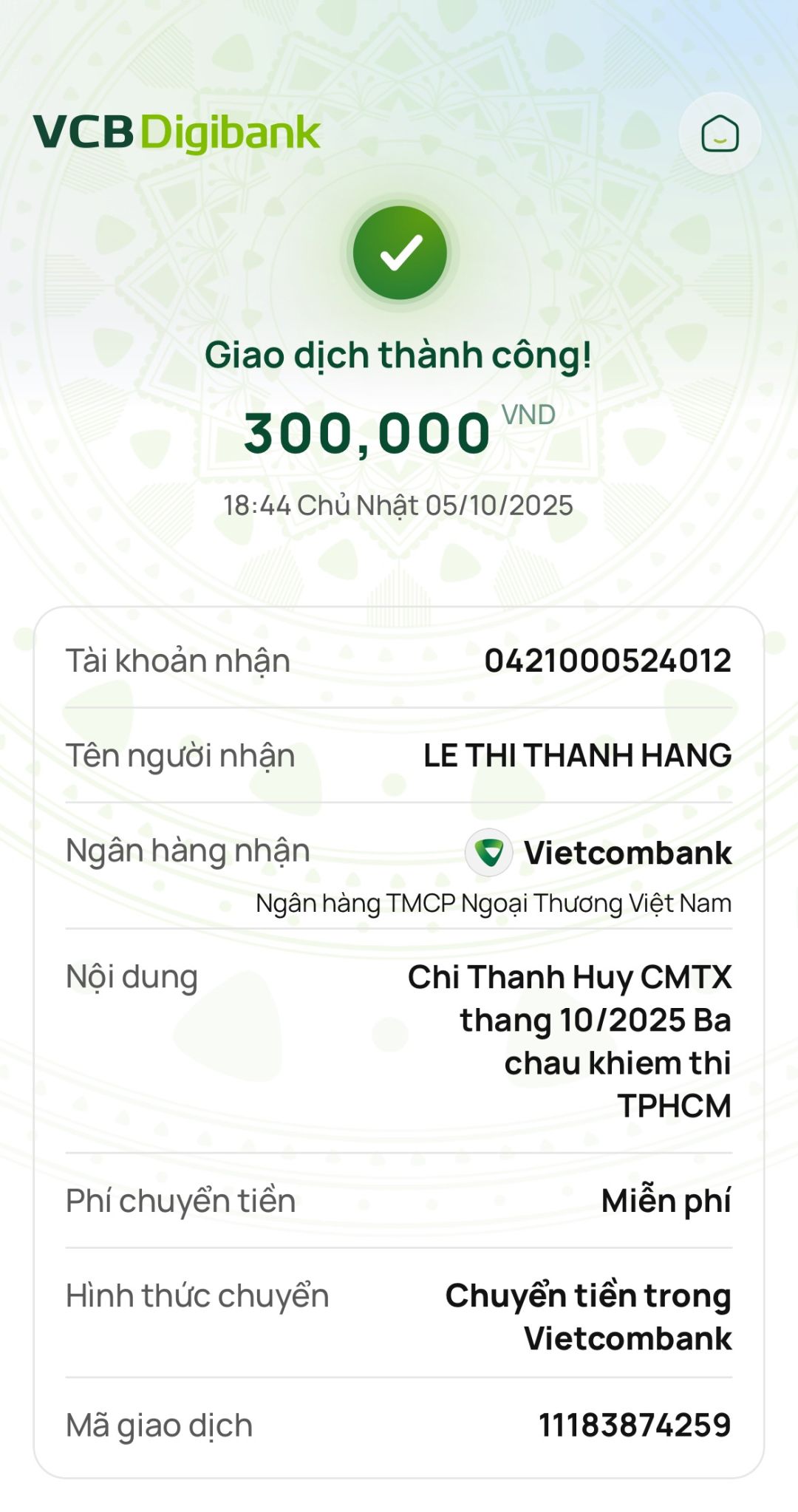 Tieuhuongduong đã chuyển CMTX tháng 9/2025 đén các cháu: 300.000đ của Michele_du & gia đình và 300.000đ của chị Thanh Huy.