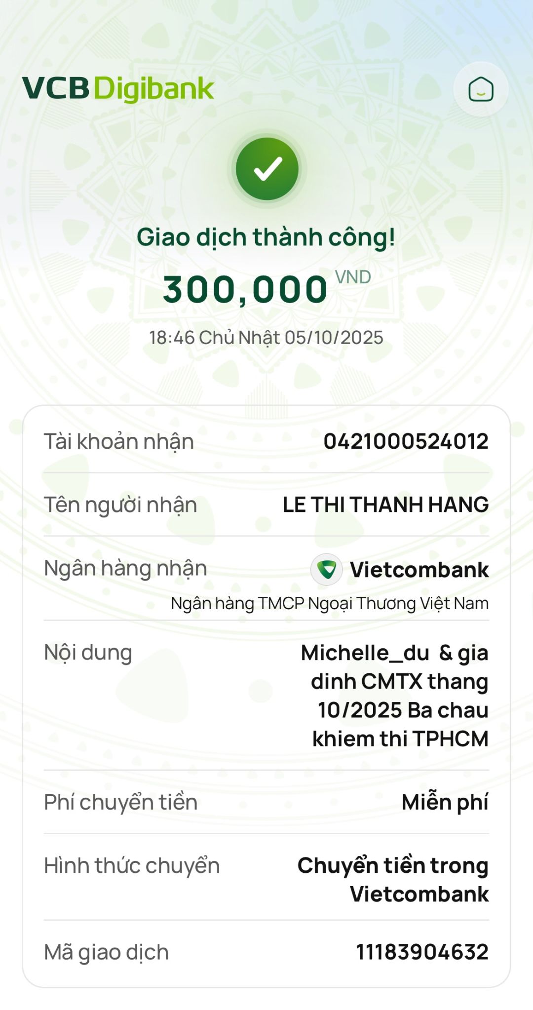 Tháng 2/2026, Tieuhuongduong đã trung chuyển 300,000đ CMTX của Michelle_du và gia đình, 300,000đ của chị Thanh Huy.