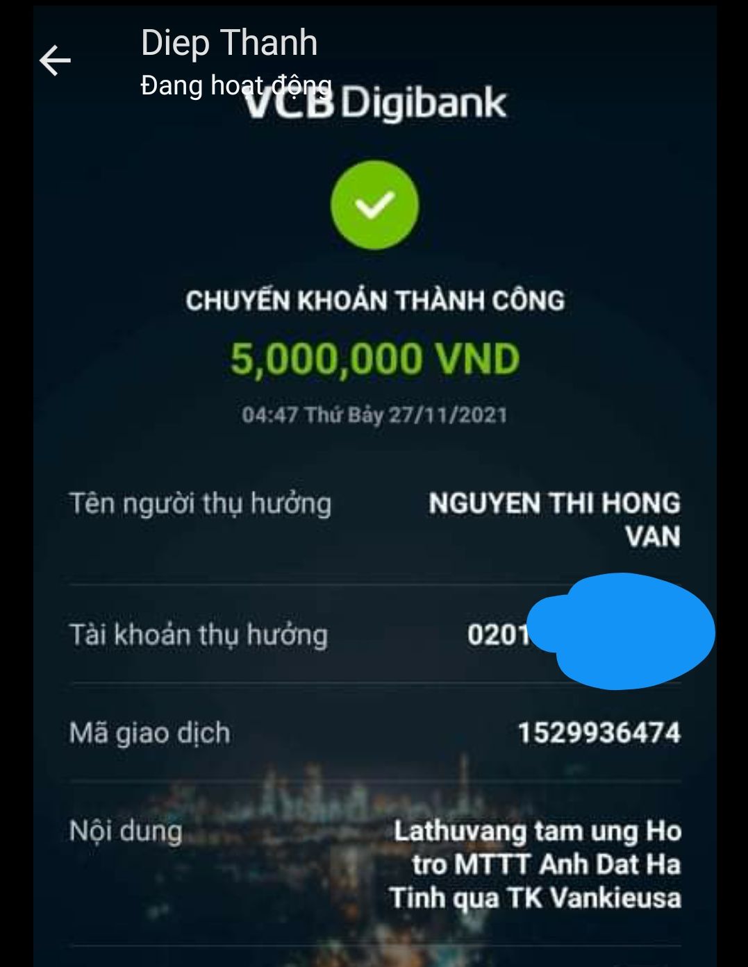 Nhờ Lathuvang ứng 5,000,000₫ gửi tới Vânkiêusa để các bạn khu vực Hà Tĩnh kịp trao tới Gia đình anh Đạt dùm nhé.