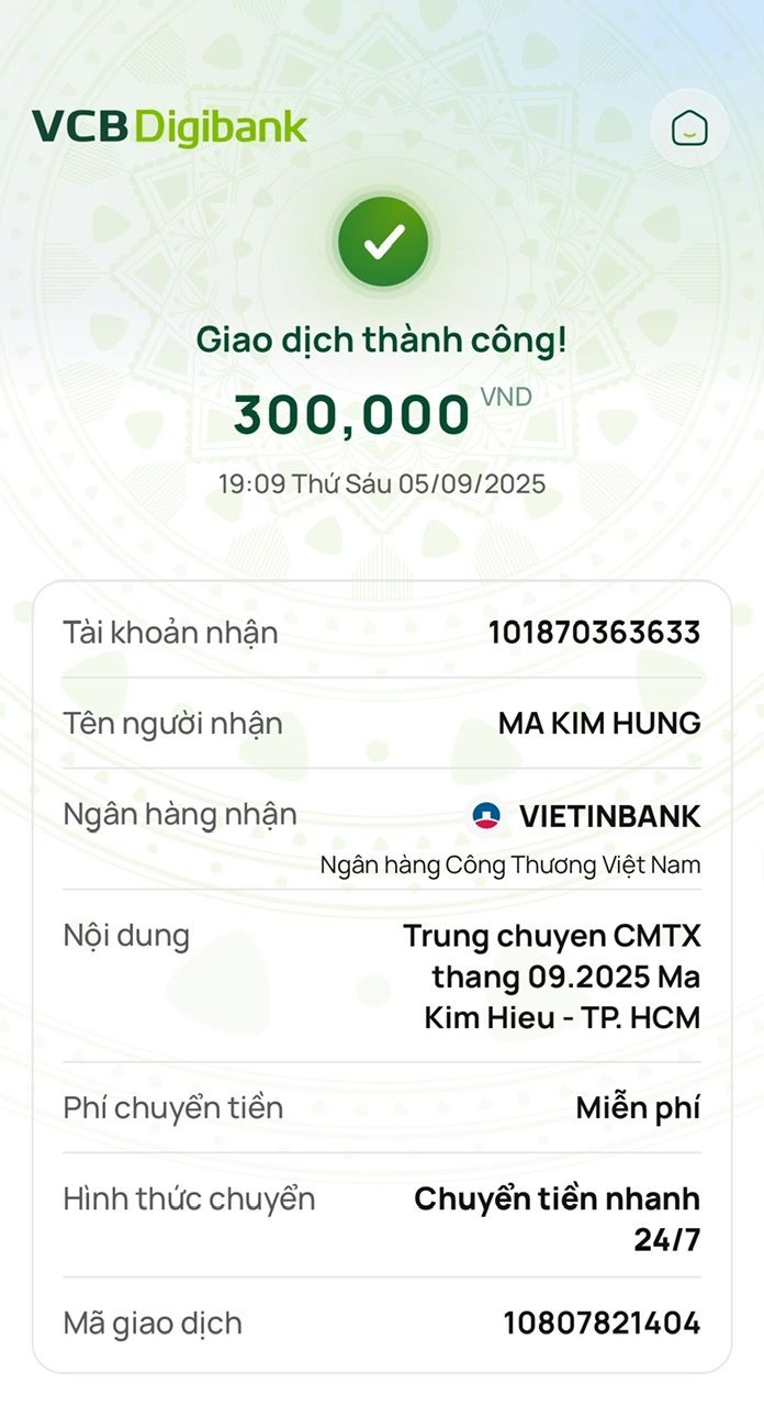 Tieuhuongduong đã chuyển CMTX tháng 8/2025 của Whoadung đến ba cháu Hiếu.