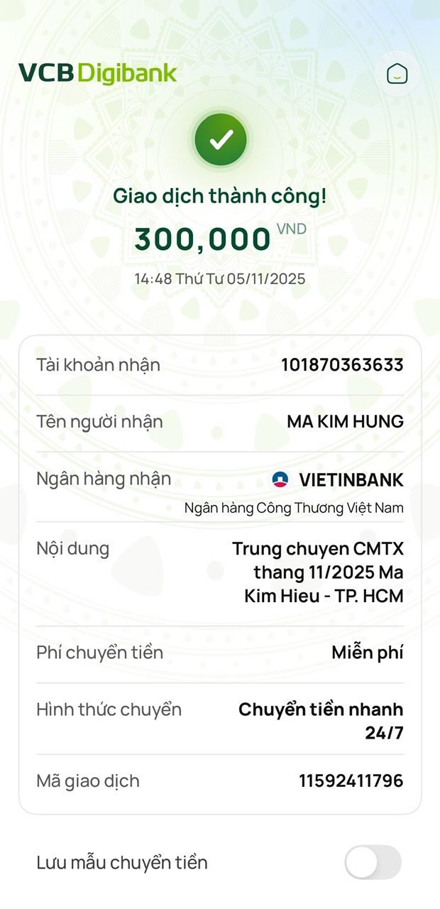 Tieuhuongduong đã chuyển 300,000đ của Whoadung CMTX tháng 11/2025 đến cháu Hiếu.