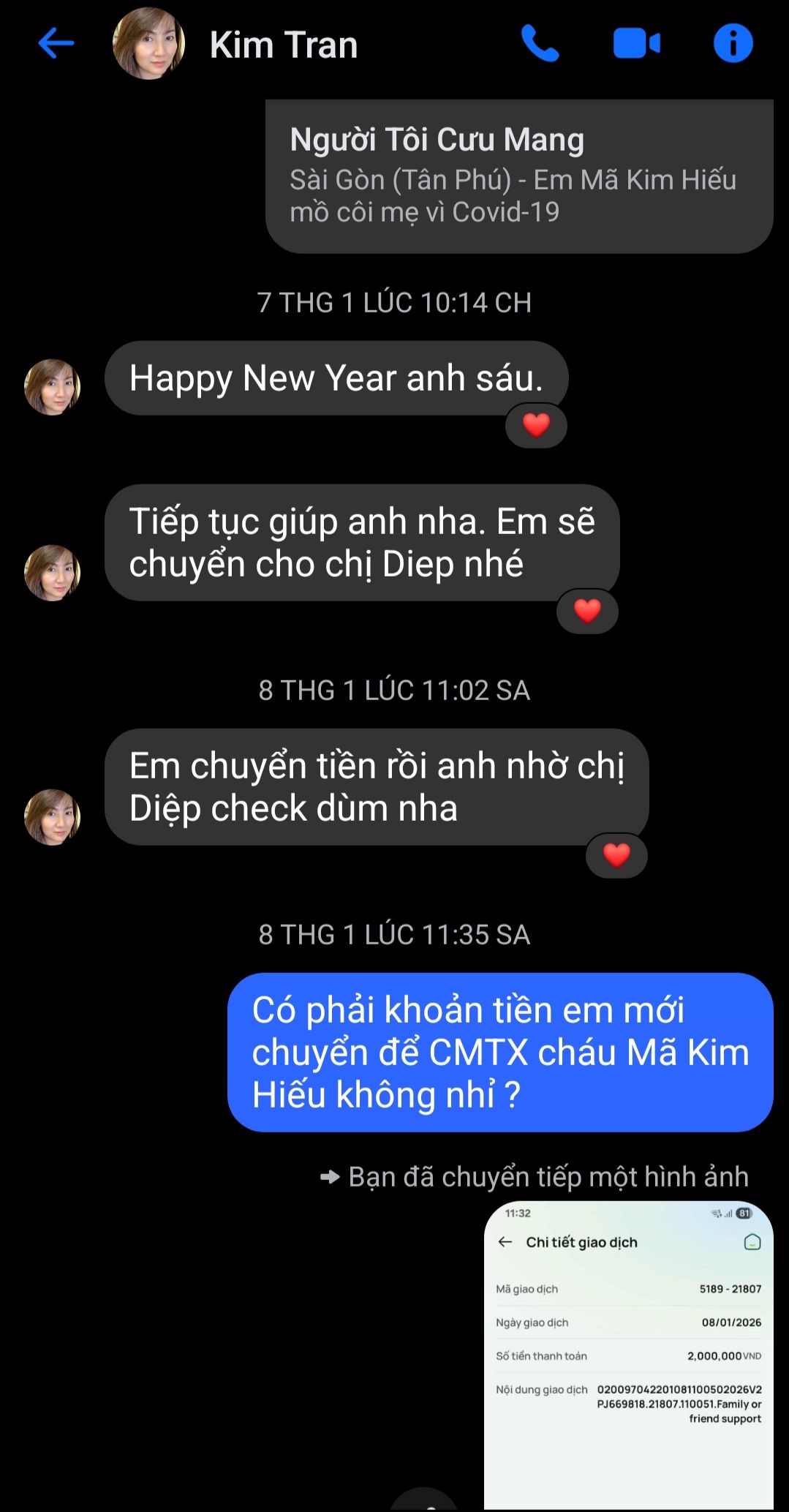 Whoadung tiếp tục CMTX cháu Hiếu và đã chuyển tiền về tài khoản của Quán Cơm 2000₫ - SG ngày 8/1/2026 rồi các bạn nhé.