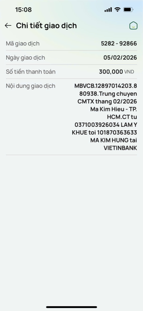 Tieuhuongduong đã chuyển 300,000đ CMTX tháng 2/2026 từ Whoadung đến cháu Hiếu.