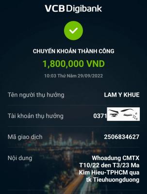 Lathuvang đã chuyển TK Tieuhuongduong 1,800,000đ CMTX T4 đến T9/2022 cháu Mã Kim Hiếu của Whoadung. Nhờ Tieuhuongduong chuyển tiếp nhé. Cảm ơn em.