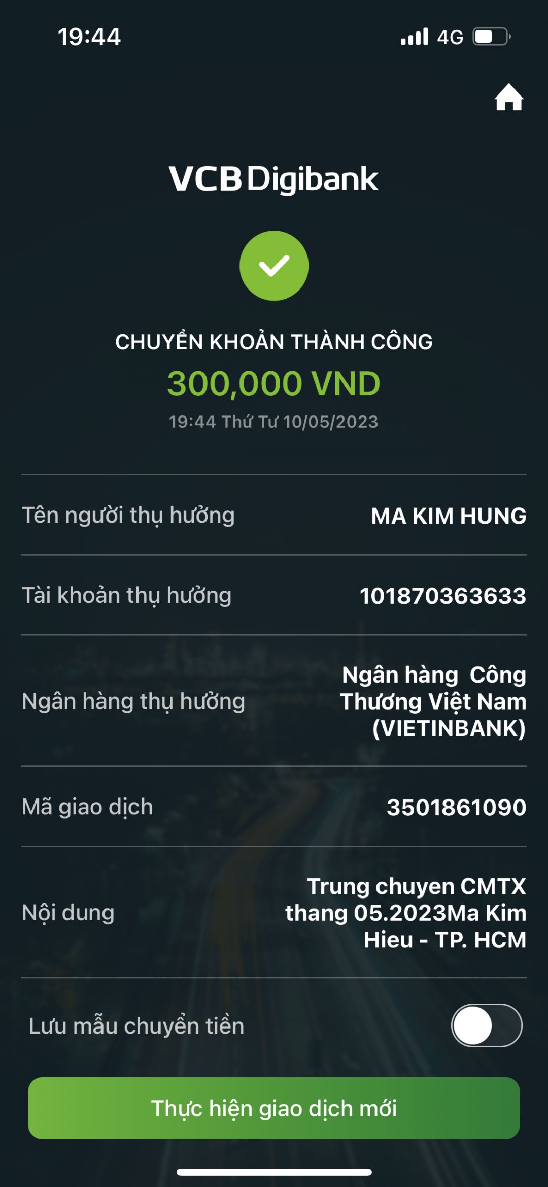 Tháng này Tieuhuongduong chuyển khoản trực tiếp CMTX 300k đến tài khoản của anh anh Mã Kim Hùng bố cháu Hiếu.