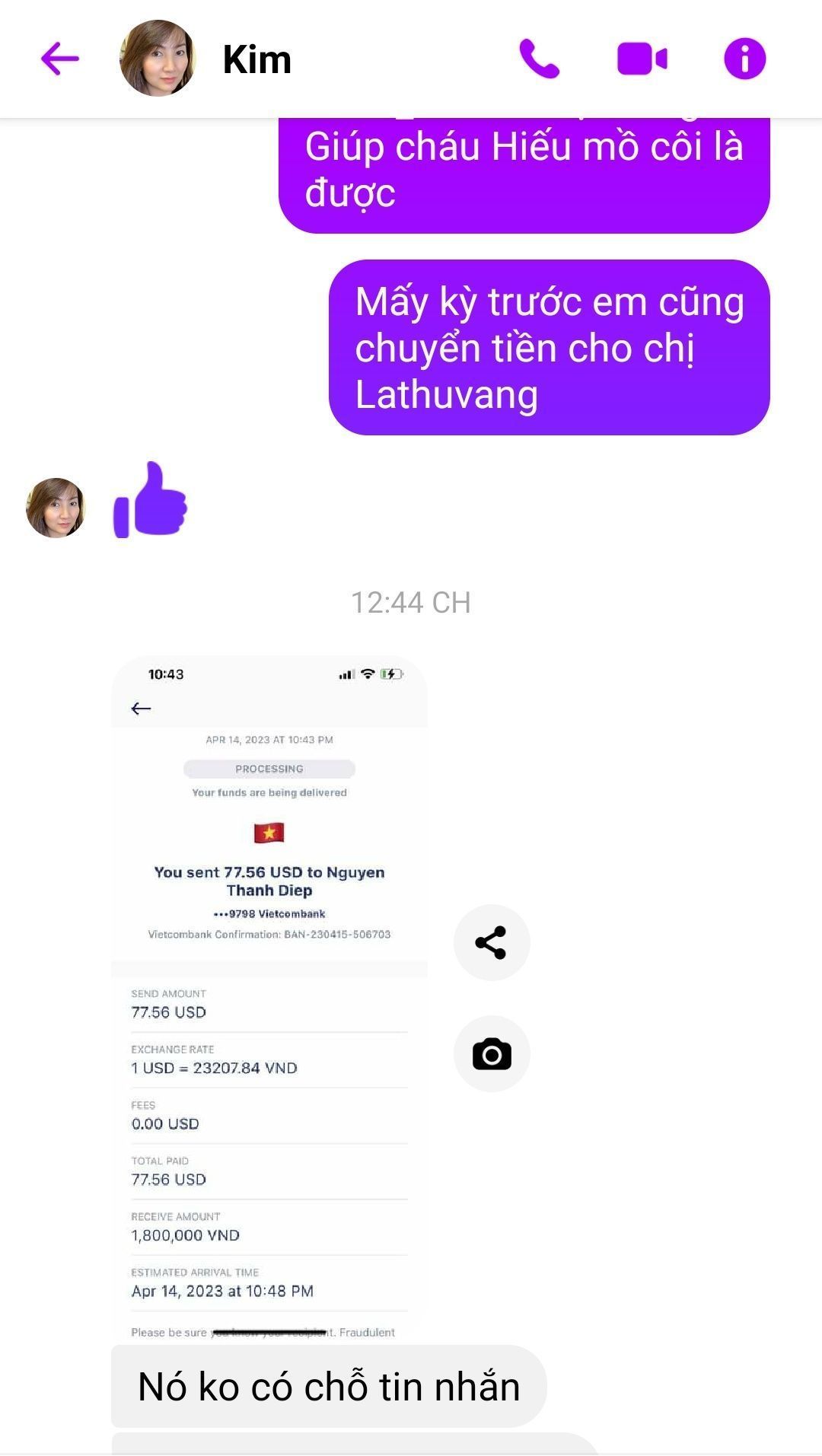 Em đã nhận được tiền 1,800,000 từ chị Lathuvang. Cảm ơn chị nhiều nhé!