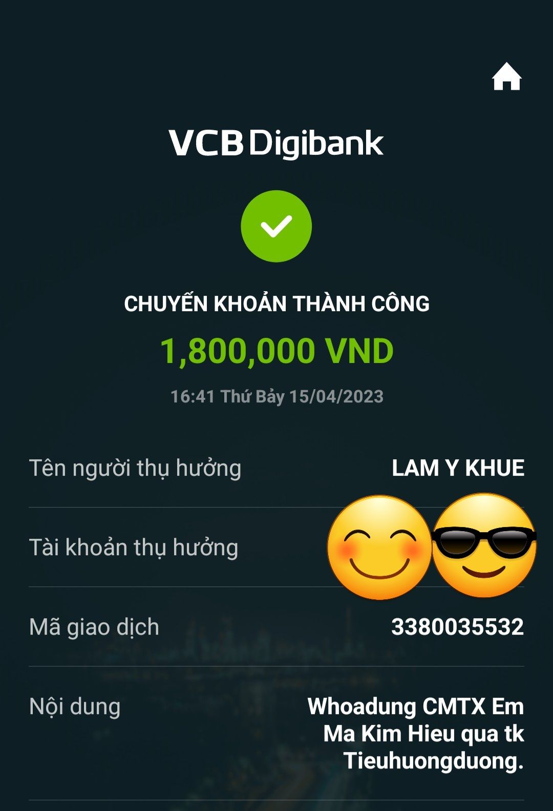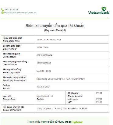 Tháng này Tieuhuongduong chuyển khoản trực tiếp CMTX 300k đến tài khoản của anh anh Mã Kim Hùng bố cháu Hiếu.