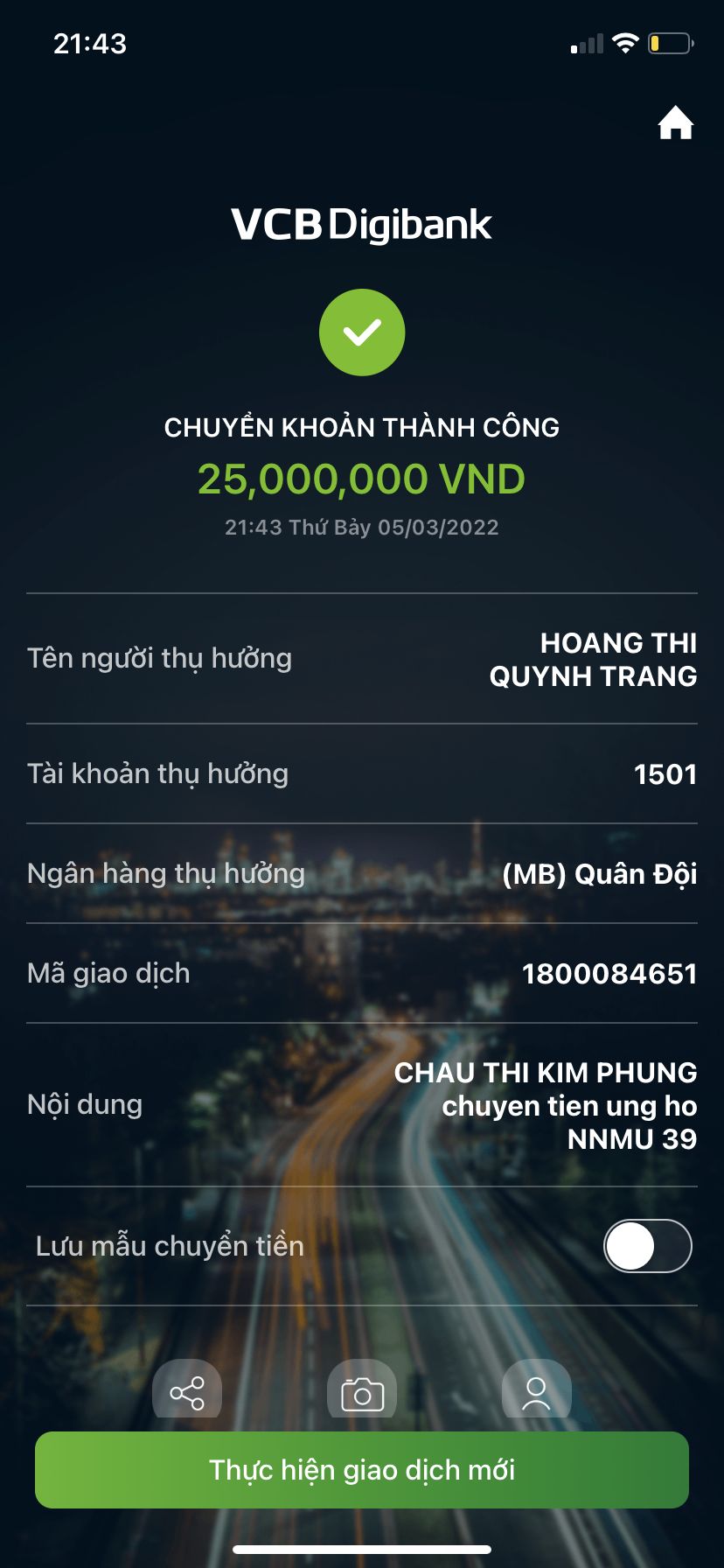 Mình đã chuyển khoản số tiền đã nhận là 39.616.500 đ cho bên vật liệu xây dựng NNMU 39 rồi cả nhà nhé. Cảm ơn cả nhà đã cùng chung tay ạ!