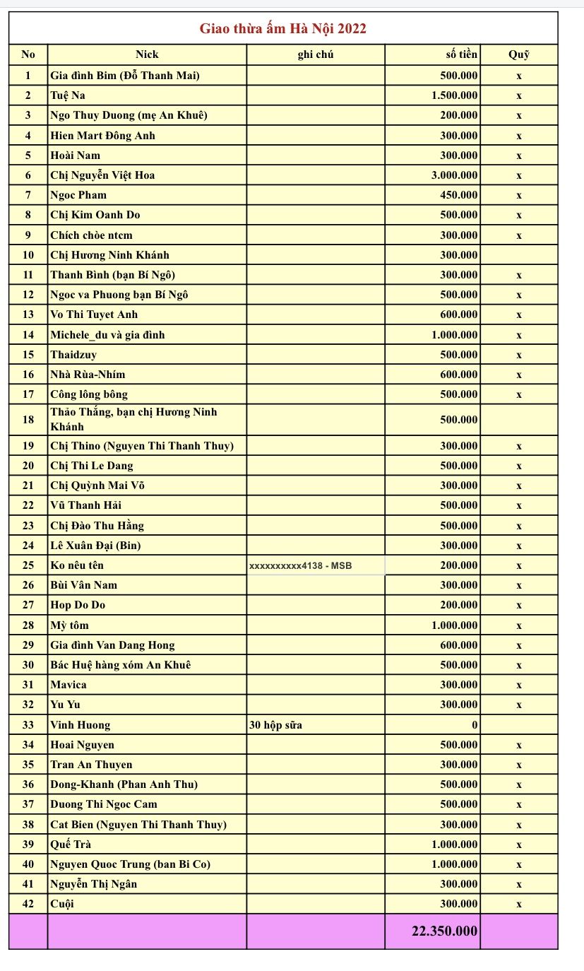 Em xin gửi cả nhà danh sách các anh chị và các bạn đã tham gia ủng hộ chương trình ạ: