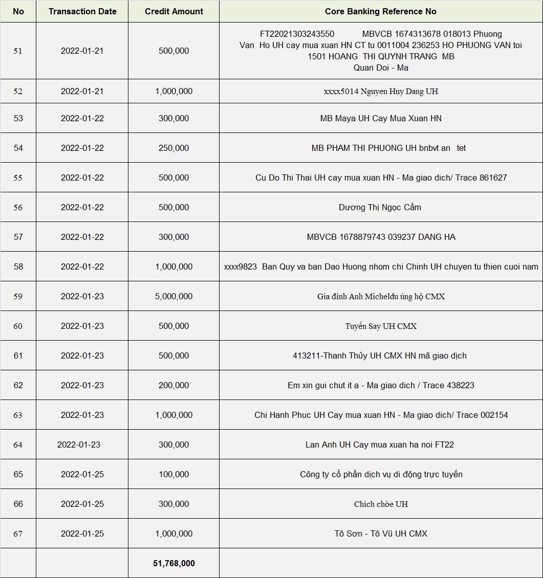Tính đến 20:00 ngày 25/5 sau 5 ngày kêu gọi Chương trình đã nhận được UH bằng hiện kim là 51.768.000 đ theo sao kê tài khoản của thủ quỹ
