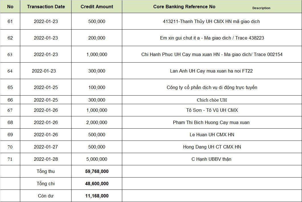 Tổng số tiên thu được theo sao kê là 59.768.000