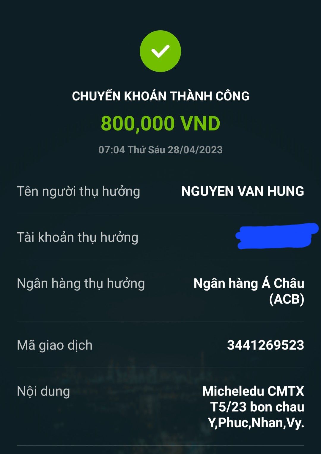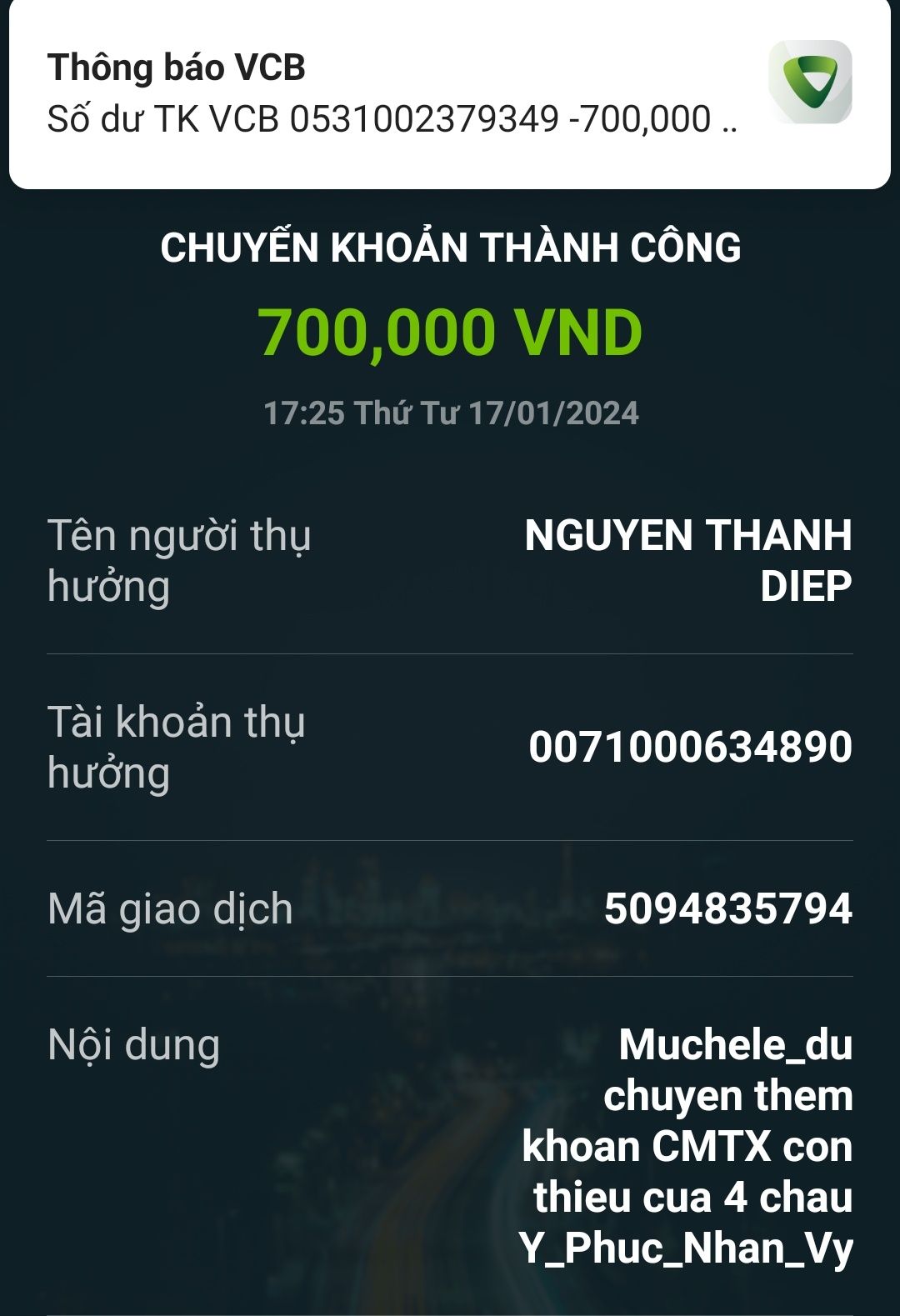 Lathuvang đã chuyển tk anh Hùng CMTX T3/23 bốn cháu Ý, Phúc,Nhân,Vy của Michele_du và GĐ.