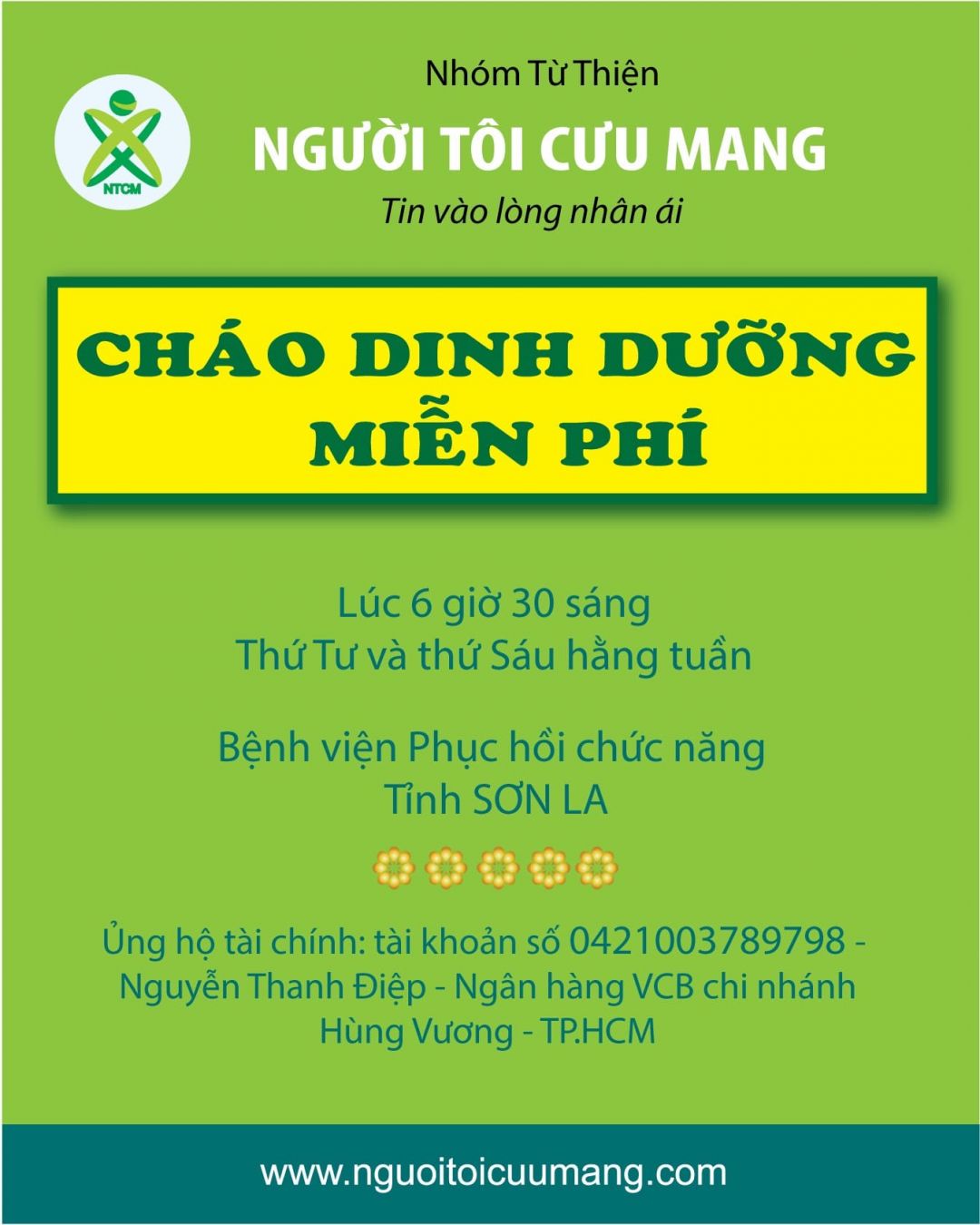 Em cảm ơn Anh/Chị NTCM và các mạnh thường quân đã chung sức. Mong tiếp tục nhận được sự ủng hộ của các Anh/chị cho Nồi cháo tại Bệnh viện Phục hồi chức năng tỉnh Sơn La.