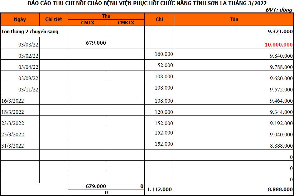 Hôm nay ngày 03/3/2022. Tôi thủ quỹ nồi cháo Bệnh viện Phục hồi chức năng Sơn La báo cáo quỹ của tháng 02/2022: Tổng chi 679.000 (tồn quỹ 9.321.000)