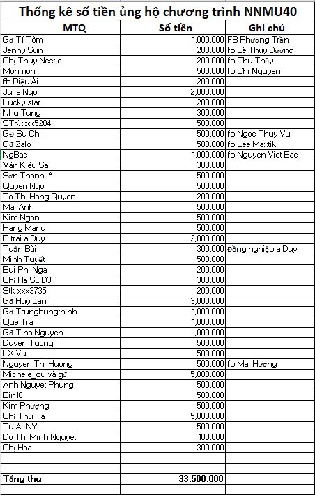 Em cập nhật thống kê ủng hộ chương trình NNMU40 đến thời điểm hiện tại qua các phần cập nhật: