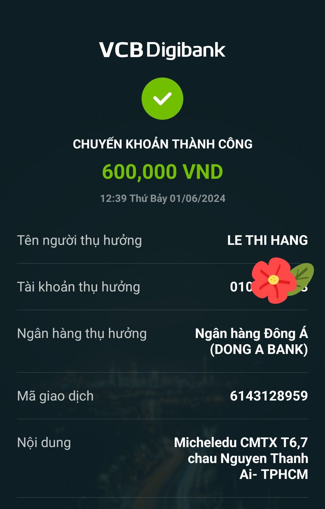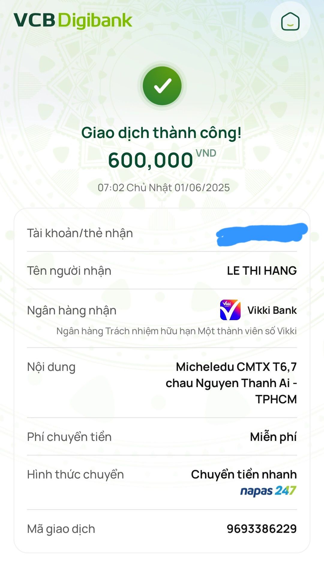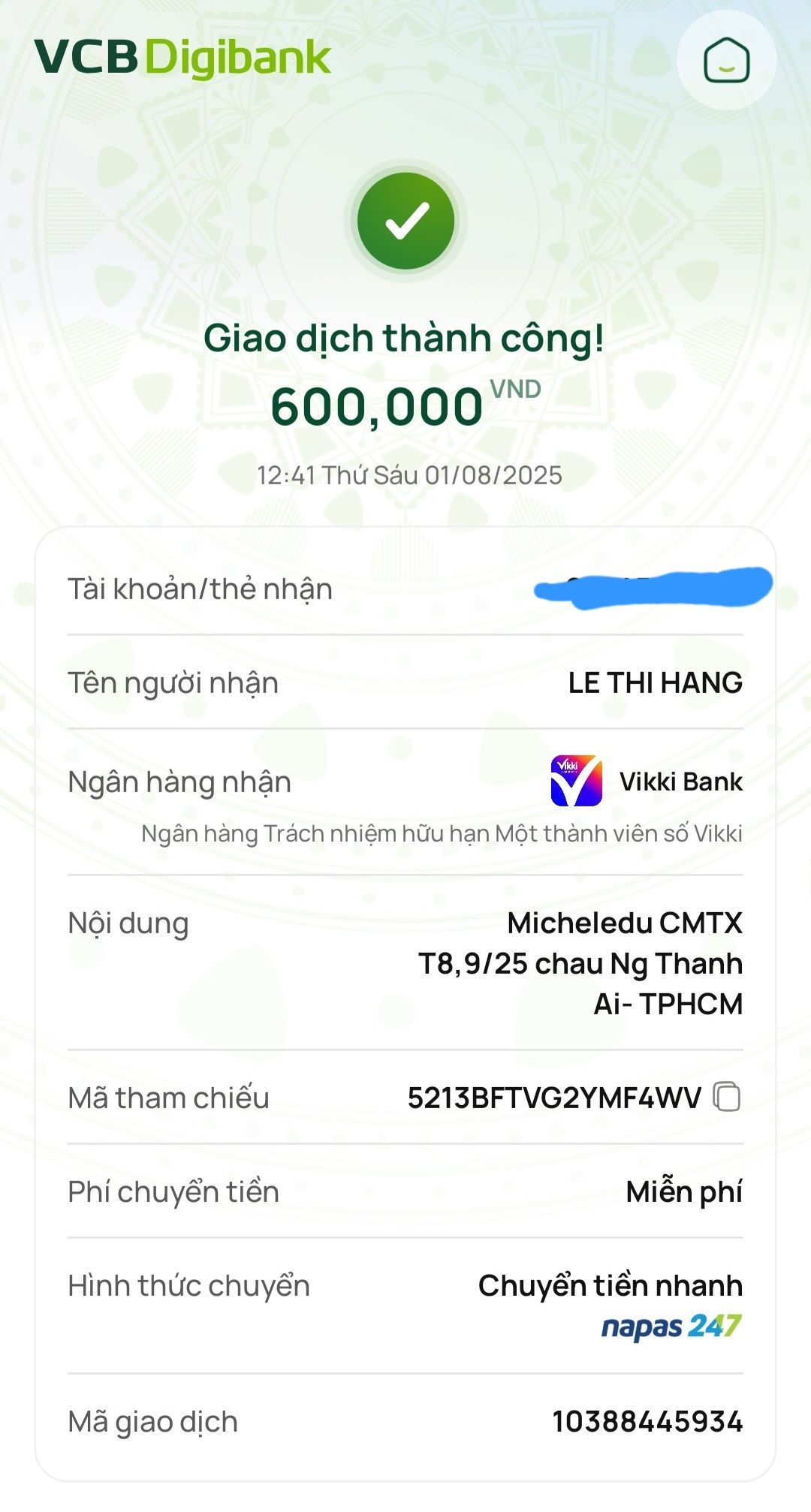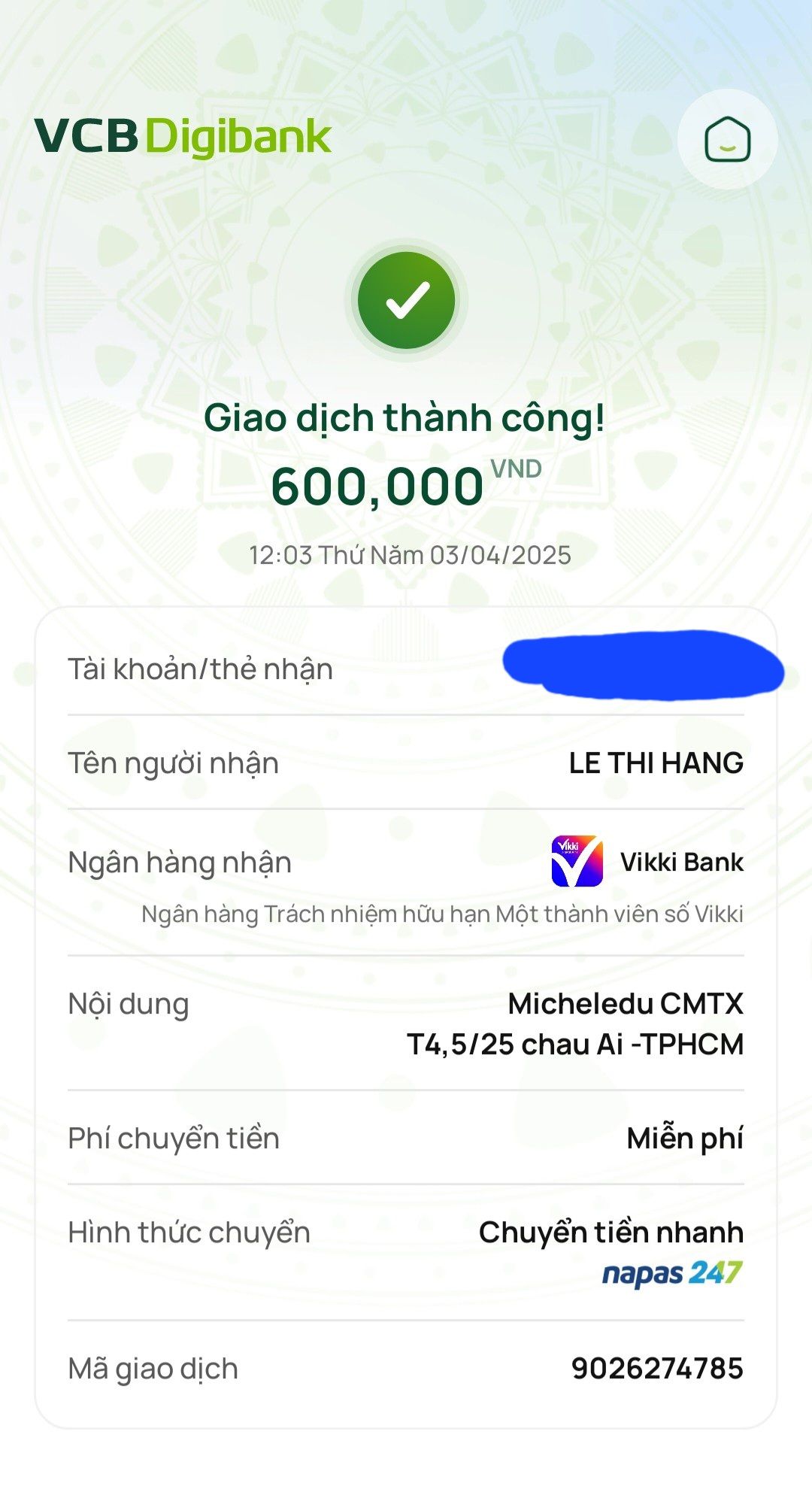Lathuvang đã chuyển CMTX T8,9/25 đến cháu Nguyễn Thành Ái của Cô Michele_du và GĐ