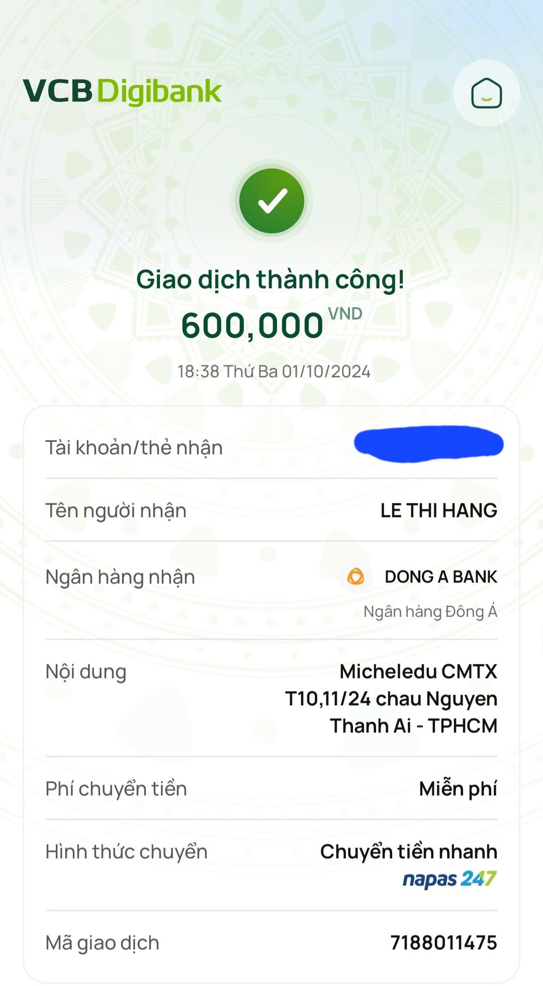Lathuvang đã chuyển CMTX T10,11/24 đến cháu Nguyễn Thành Ái.
