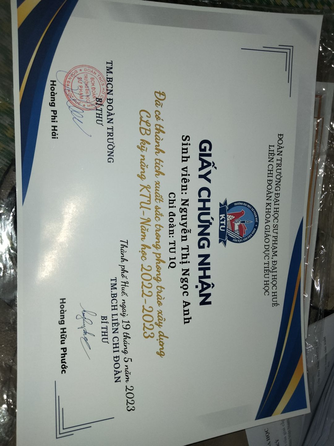Cháu xin phép cập nhật kết quả học tập HK1 của cháu như bên dưới ạ! Cháu được xét vào 10 đoàn viên ưu tú của lớp và đạt điểm rèn luyện xuất sắc. Bên cạnh đó, qua suốt quá trình cố gắng tham gia các hoạt động của CLB thì cháu có được cấp giấy chứng nhận.
