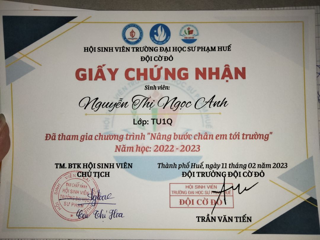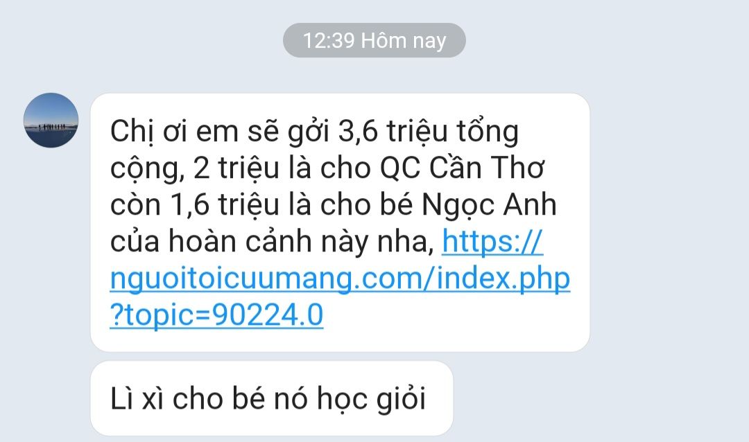 Hiện tại con đã nhận được phần quà trị giá 1 600 000 đồng của cô(chú) (TV giấu tên của NTCM) được cô lathuvang gửi đến con. Con xin cảm ơn cô(chú), cô lathuvang và quý MTQ mặc dù không phải lúc nào cũng nói ra nhưng các cô chú vẫn luôn theo dõi quá trình học tập của con. Món quà mà các cô chú gửi đến con không chỉ có giá trị vật chất mà còn là giá trị tinh thần, động lực để con cố gắng hơn mỗi ngày.