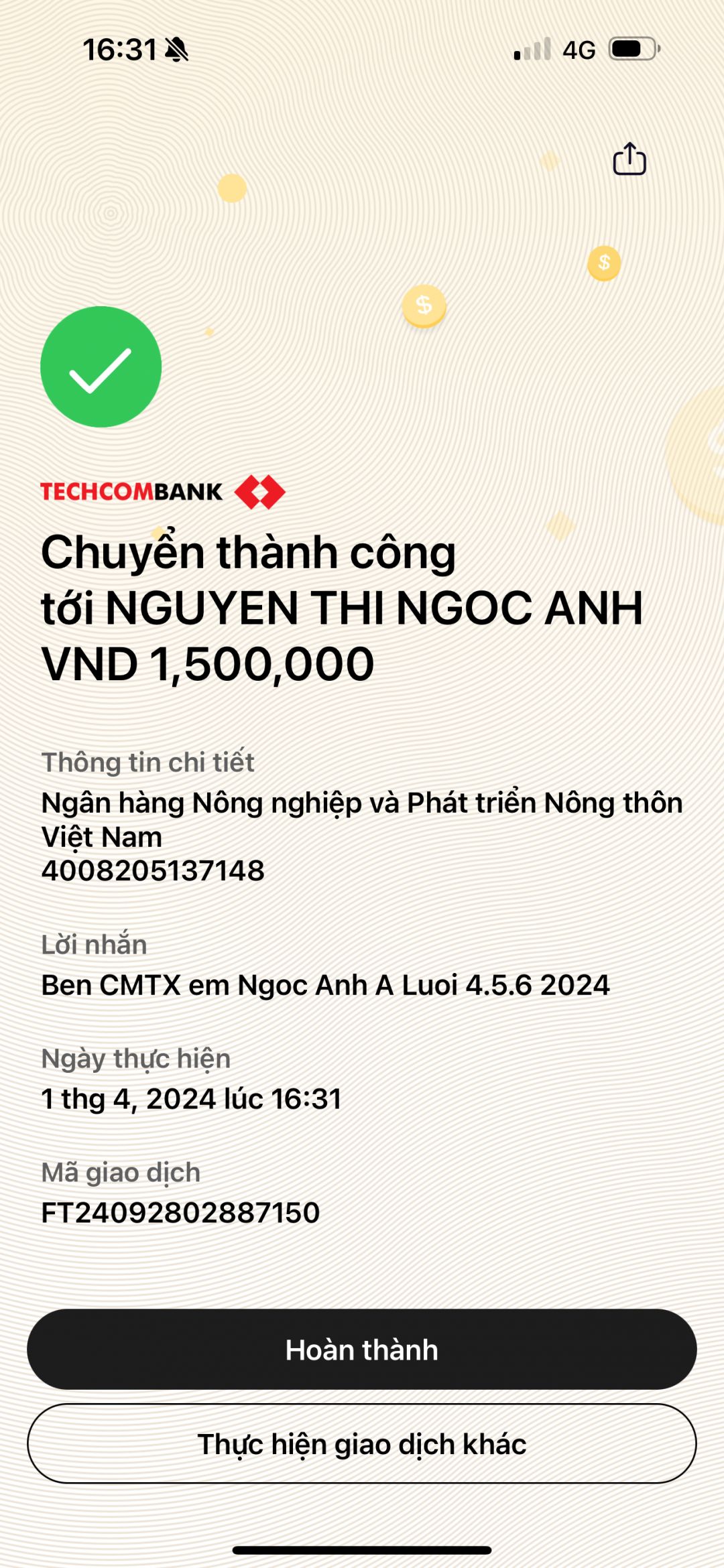 Chú Ben gửi phần CMTX tháng 3.2024 tới Ngọc Anh nhé! Chúc con học giỏi!