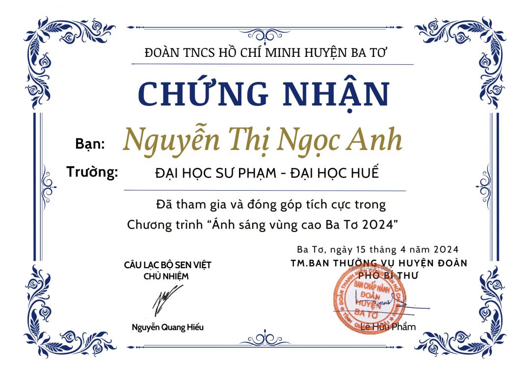 Bây giờ, con đã bắt đầu năm học mới và đã là sinh viên năm 3 khoa GDTH, Trường ĐH Sư phạm, Đại học Huế. Hiện tại con vẫn làm dạy kèm gia sư với thu nhập khoảng 1 triệu/ 1 tháng. Trong suốt thời gian hè 2 tháng vừa qua con cũng tham gia nhiều hoạt động ý nghĩa như tiếp sức mùa thi, hỗ trợ thí sinh thi năng khiếu và hoạt động tình nguyện hè, tham gia giải chạy, hiến máu... Đạt giải Khuyến khích Cuộc thi "Đại sứ văn hoá đọc toàn trường". Các hoạt động này và nhiều thành tích Đoàn - Hội của con đều có giấy khen nhưng con chưa kịp nhận để cập nhật ạ! Khi có con sẽ cập nhật sớm nhất.