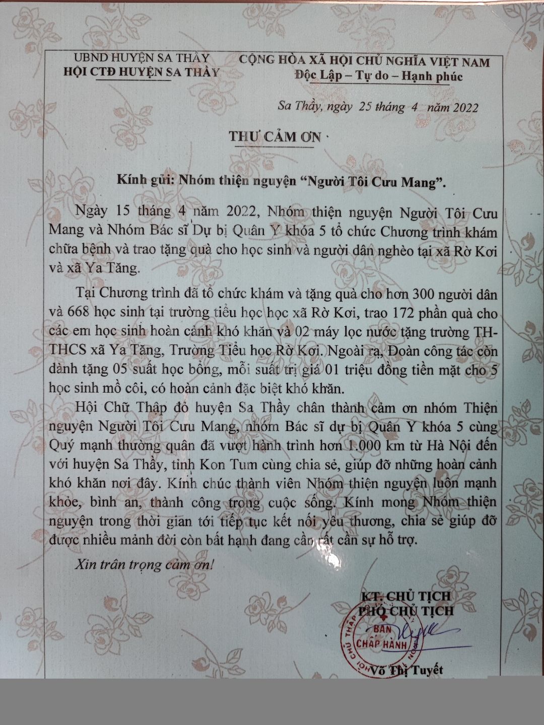 UBND huyện Sa Thầy gửi thư cảm ơn, ghi nhận Tấm Lòng Vàng cho chương trình. Gửi lời cảm ơn đến các anh chị, các nhà hảo tâm, các Mạnh thường quân đã ủng hộ cho Huyện ạ!