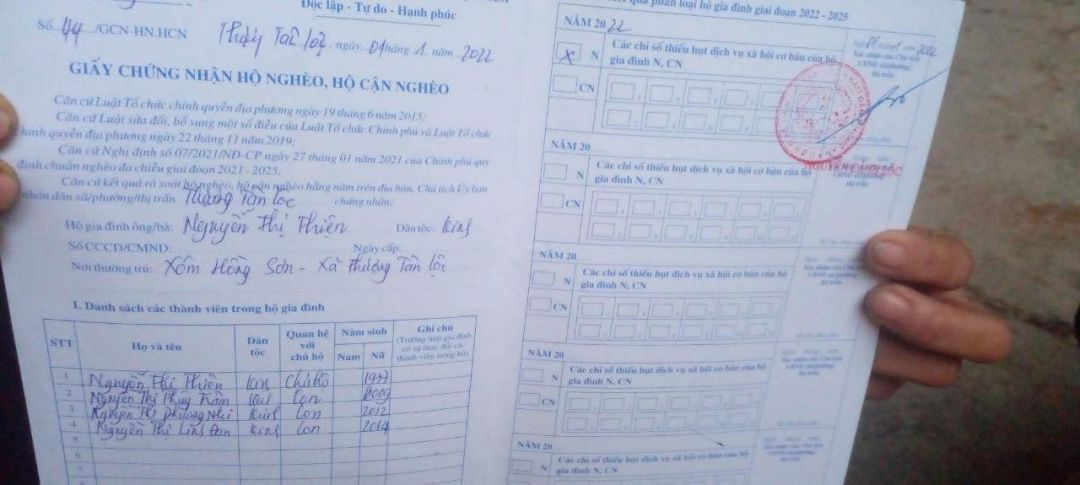 Con chào cả nhà ạ, hoàn cảnh dì Thiện tụi con đã xác minh. Một mình dì Thiện nuôi ba con nhỏ. Các con cũng đang trong độ tuổi lớn nên hoàn cảnh thực sự rất khó khăn. Gia đình mẹ con dì không có một vật dụng gì đáng giá ngoài chiếc xe đạp của các cháu đi học. Một mình dì từ lúc chồng mất đi một mình gồng gánh cố gắng giấu đi những vất vả cực nhọc để luôn lạc quan để các con được học hành và có một tuổi thơ vui vẻ như những người bạn cùng trang lứa. Tụi nhỏ cũng biết sự vắng bóng của người cha khiến bao nhiêu gánh nặng đè lên vai người mẹ của mình nên các con rất ngoan hiền, và luôn cố gắng làm nguồn động viên cho mẹ. Nhưng các bé đều đang tuổi lớn nên có rất nhiều khoản phải chi tiêu như học hành, bút vở, quần áo, ăn uống. Một người mẹ đơn thân một mình nuôi một đứa con nhỏ đã vất vả, đằng này những ba nên khiến cuộc sống của ba mẹ con đã khó khăn lại khó khăn thêm. Chồng bị đột tử mất cuối năm 2013, lúc này con đầu chị 4 tuổi con thứ hơn 1 tuổi và con thứ 3 lúc này vừa có thai hai tháng. Một mình lúc đó bụng mang dạ chửa thêm hai đứa con dại một mình nén nỗi đau để tiếp tục cuộc sống, để nuôi các con khôn lớn. Hiện nay cháu đầu đã học lớp 8 cháu thứ 2 học lớp 5 và cháu út học lớp 3. Các con ngày càng lớn khiến ngày càng nhiều thứ phải lo toan khiến đôi vai luôn cố gắng ngày nào đã gần kiệt sức. Hiện tại khó khăn vẫn vây bủa khó khăn, toàn bộ chi tiêu uống con cái học hành, tiền chợ tiền gạo tất thảy đều nhìn vào khoản trợ cấp nuôi con đơn thân mỗi tháng 360.000 cháu/ tháng, số tiền này chị dành để nuôi các con. Với ngày ngày chị đi làm thuê cuốc mướn, ai thuê gì chị làm để kiếm thêm thu nhập nuôi con. Hoàn cảnh rất đáng thương. Kính mong BQT xem xét, kết nối, tạo điều kiện giúp đỡ hoàn cảnh mẹ con chị Thiện, để các con được sống vui vẻ hồn nhiên, an tâm học hành đúng như độ tuổi các cháu vốn có. Tụi con xin đề xuất cưu mang thường xuyên mỗi tháng 500.000 đồng, để giúp phần nào cho mẹ con chị, cũng động viên chị tiếp tục cố gắng vượt lên số phận để các cháu nhỏ có một tương lai tốt đẹp hơn. Mong cả nhà quan tâm giúp đỡ ạ!