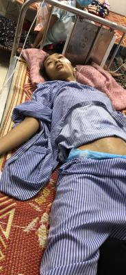 Tình trang rất nguy kịch chị bị gảy 2 xương sườn số 10 và 11,dập lách, chảy máu trong, tụt huyết áp còn 80/40 và tràn dịch ổ bụng nên phải mổ cấp cứu, do bị chảy máu trong nên từ khi mổ đến hôm nay chị phải liên tục chuyền máu