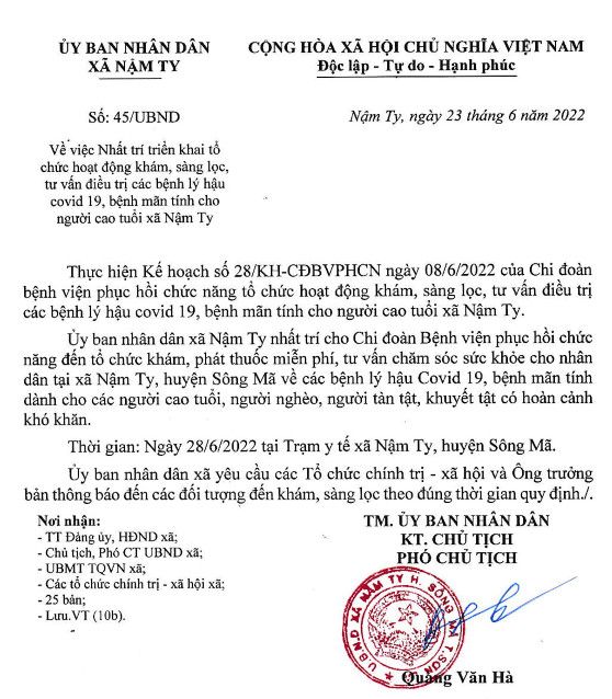 XIN GỬI QUÝ ANH CHỊ CÔNG VĂN NHẤT TRÍ TRIỂN KHAI CHƯƠNG TRÌNH KHÁM BỆNH TÌNH NGUYỆN NGÀY 28.6 CỦA ỦY BAN NHÂN DÂN XÃ NẬM TY