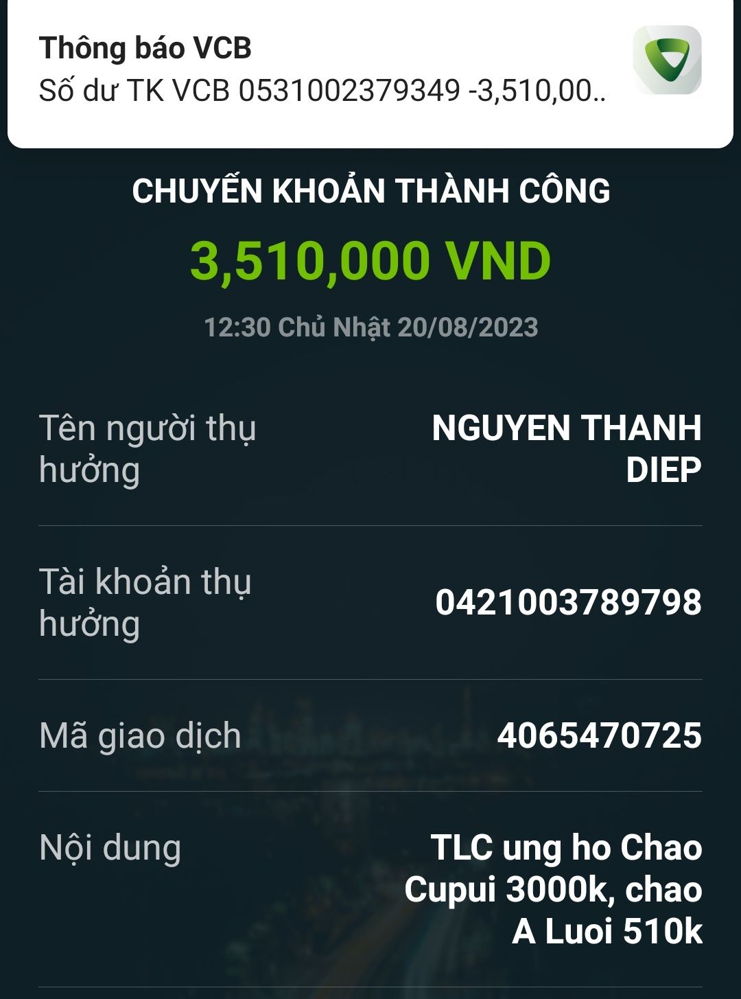 TLC và Gia đình ủng hộ nồi cháo A Lưới 510,000₫ và đã chuyển tiền các bạn nhé.