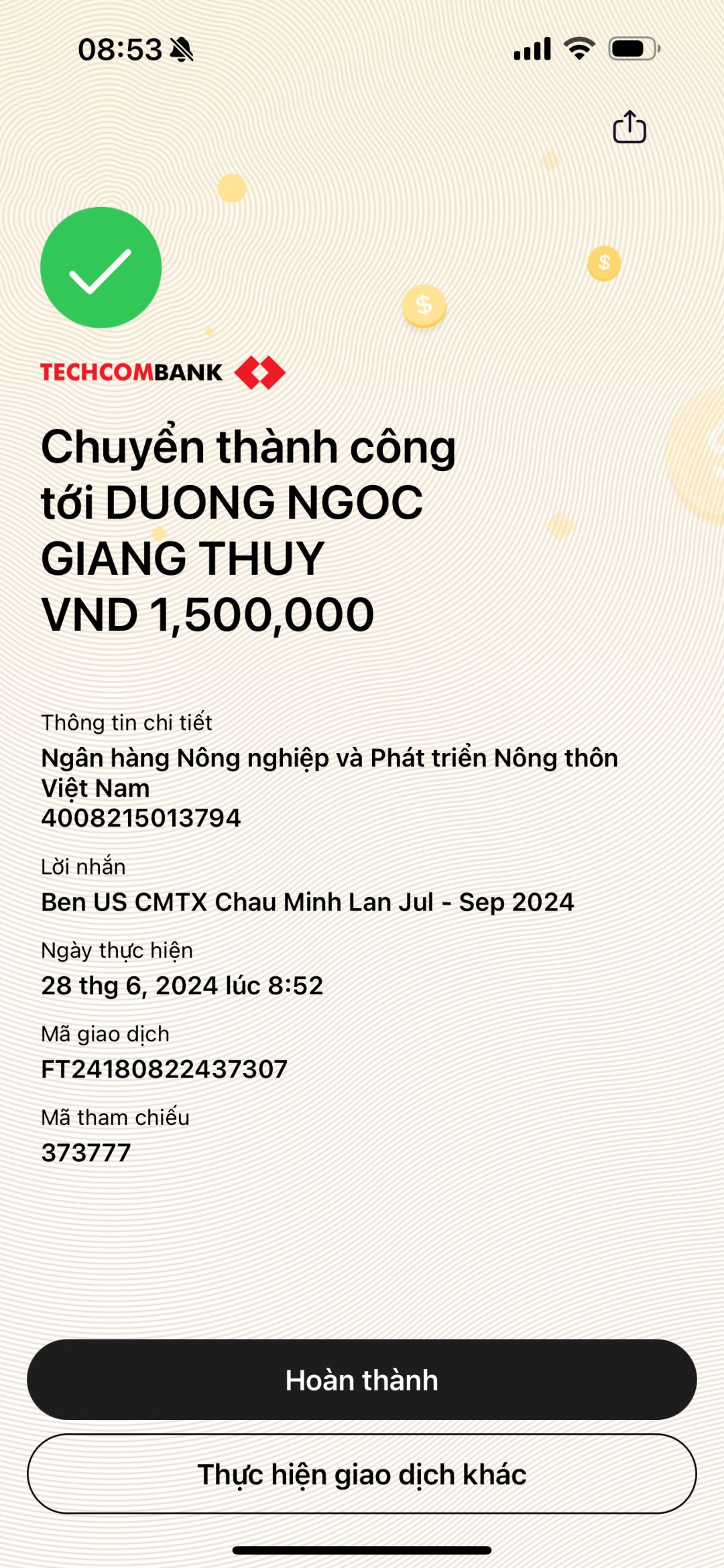 Kỳ này Chú Ben chuyển tiền CMTX cả quý 3/2024 (7-9/2024). Mong cô Wendy thu xếp rút tiền từng tháng để lo cho bé nhé!