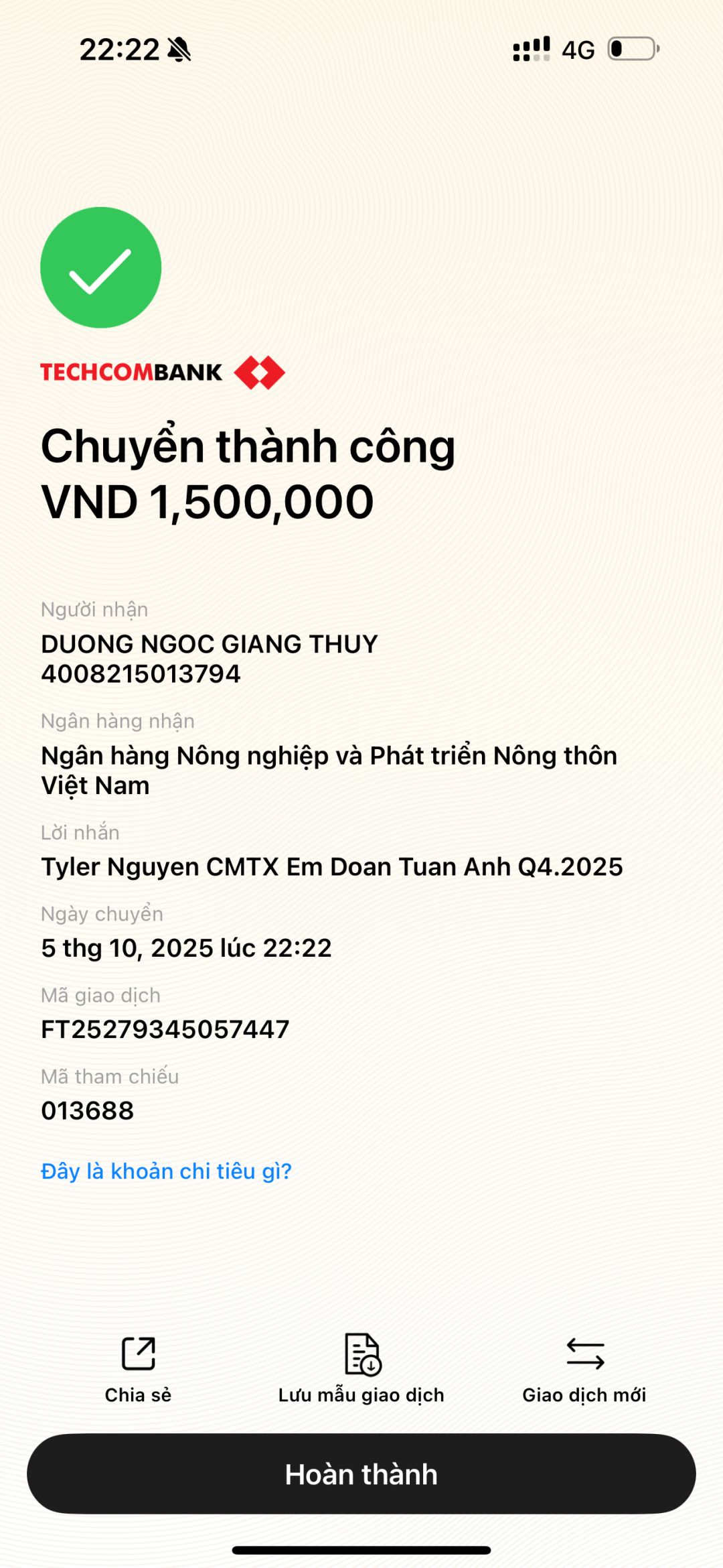 Chú Tyler Nguyen tiếp tục giúp đỡ cháu. Số tiền CMTX Q3/2025 đã được chuyển khoản.