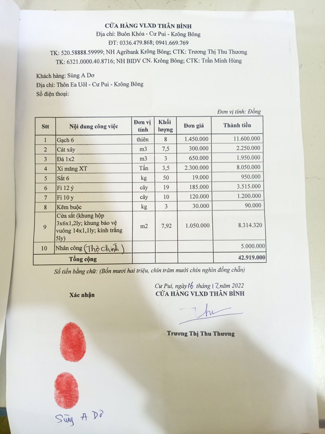 Mình xin thông tin các chứng từ giao, nhận tiền và hoá đơn nguyên vật liệu xây dựng NNMU 42.