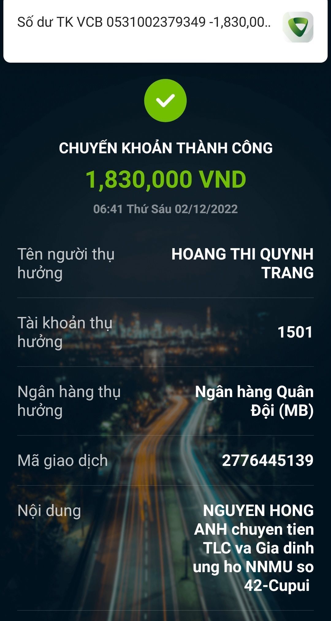 Em xin ủng hộ NNMU 42: 1.000.000 đồng, đã chuyển tiền vào tài khoản Thủy quỹ. Trân trọng!